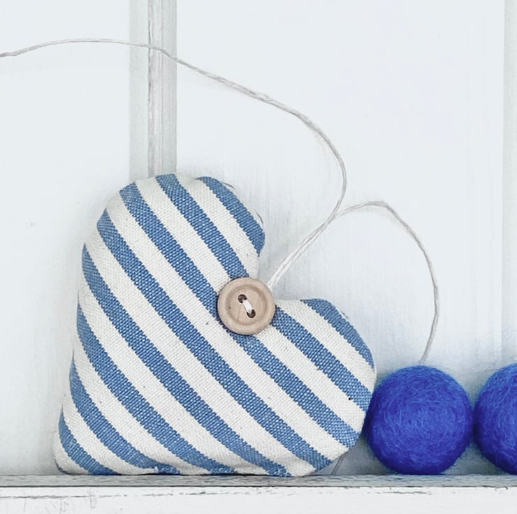A beautifully shaped cornflower blue striped heart decoration, fragrant with Hampshire lavender or plump with toy-grade stuffing.. The fabric is a superior quality woven cotton with a lovely weighty feel. Each heart is hand finished with a little round wooden button and with natural hemp twine hanging ties.