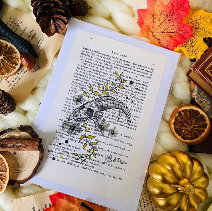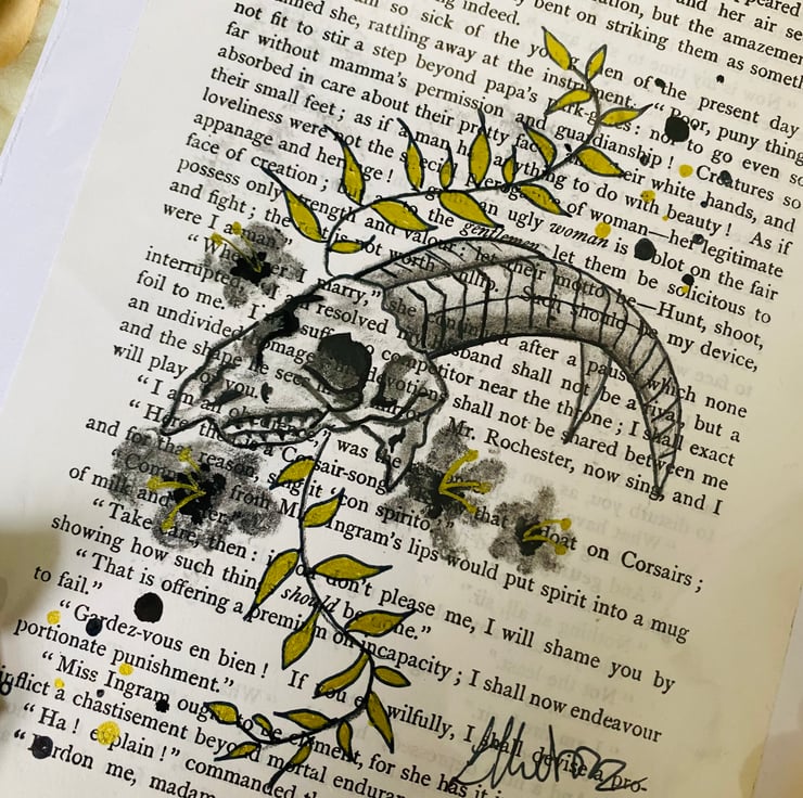 Hand drawn original art depicting a goar skull drawn onto the pages of damaged books to give them a new lease of life. I love the world of dark academia and dark fantasy and all my original pieces are inspired by this world.