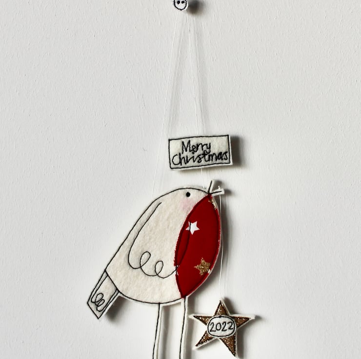 Mr Robin is created using 100% cream wool felt, cotton cloth, glitter cloth and free hand machine embroidery; multiple layers of cloth are sewn together and cut out by hand using very sharp scissors. With a linen string to suspend.