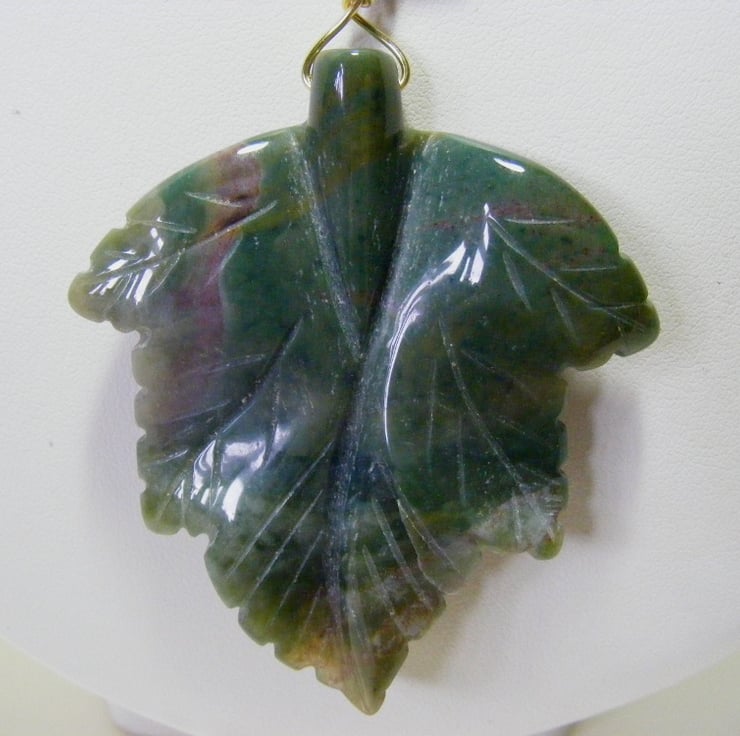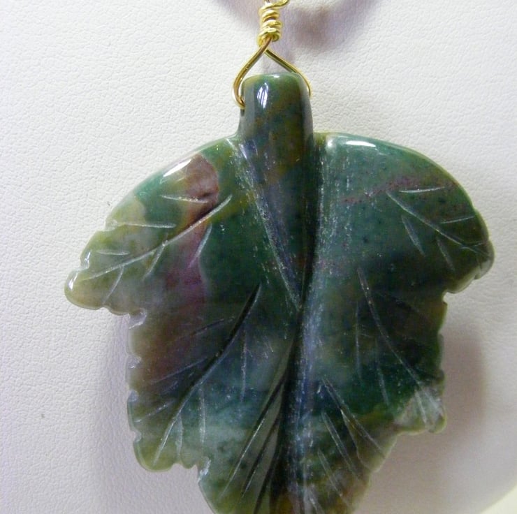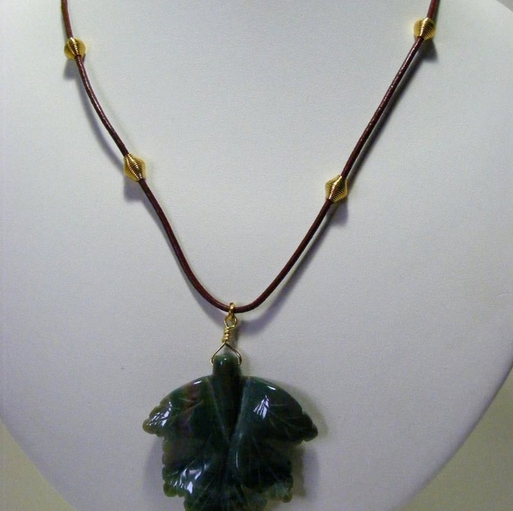 This lovely hand carved Jasper leaf measures 60x46mm. I've wire wrapped the leaf with gold plated wire and threaded onto brown leather thong. 9x7mm gold plated wire beads are also threaded onto the thong. Gold plated findings, extension chain and lobster claw clasp complete the necklace.