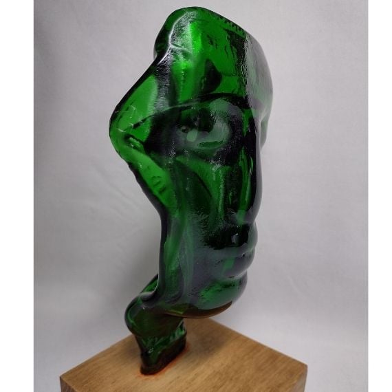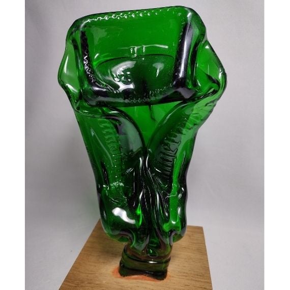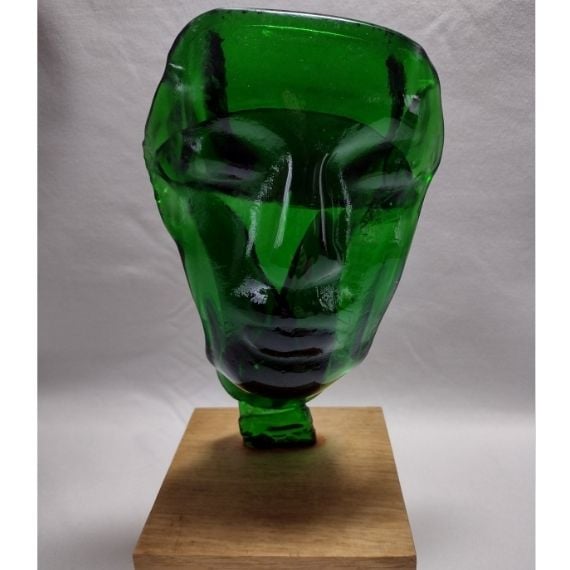 This serene face sculpture was formed from a Jagermeister bottle, kiln-formed and slumped into shape. It sits in a permanent oak stand with protective felt base.