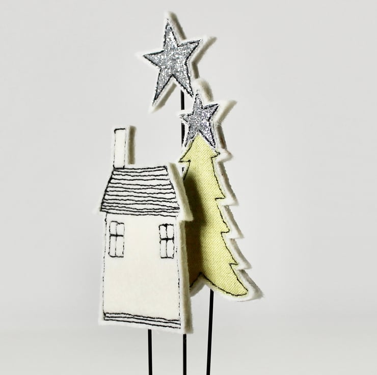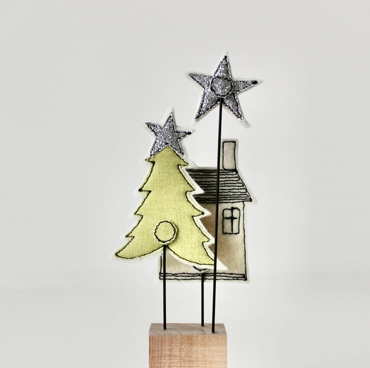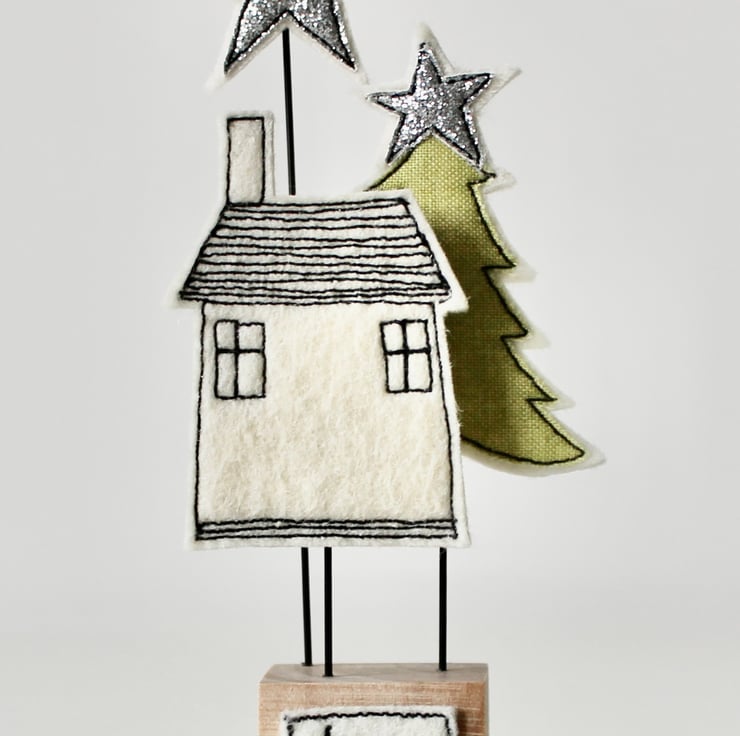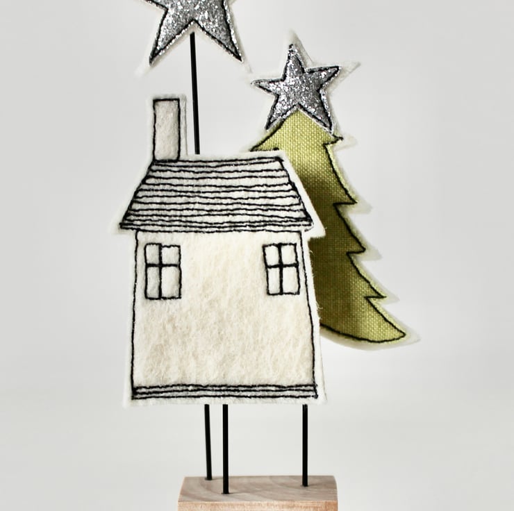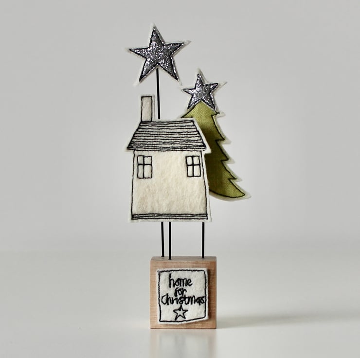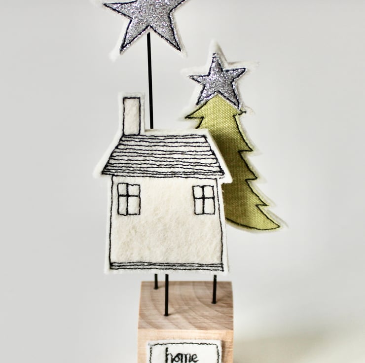 The house, tree, star and 'home for Christmas' label are sewn using 100% wool felt, cotton cloth, glitter cloth and free hand machine embroidery; multiple layers of cloth are sewn together and cut out by hand using sharp scissors.