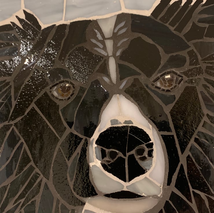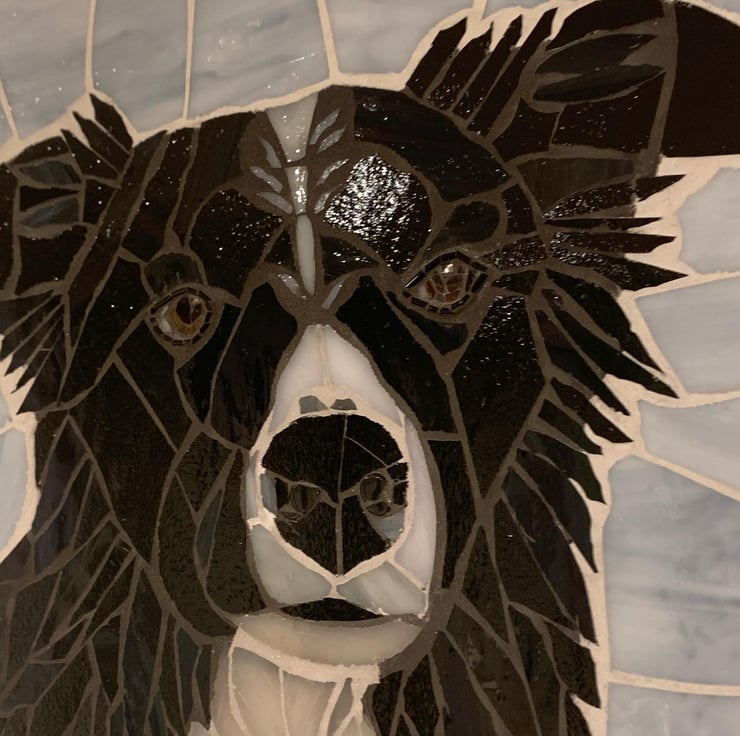 Customised mosaic pet portrait using your own photo made entirely from stained glass.