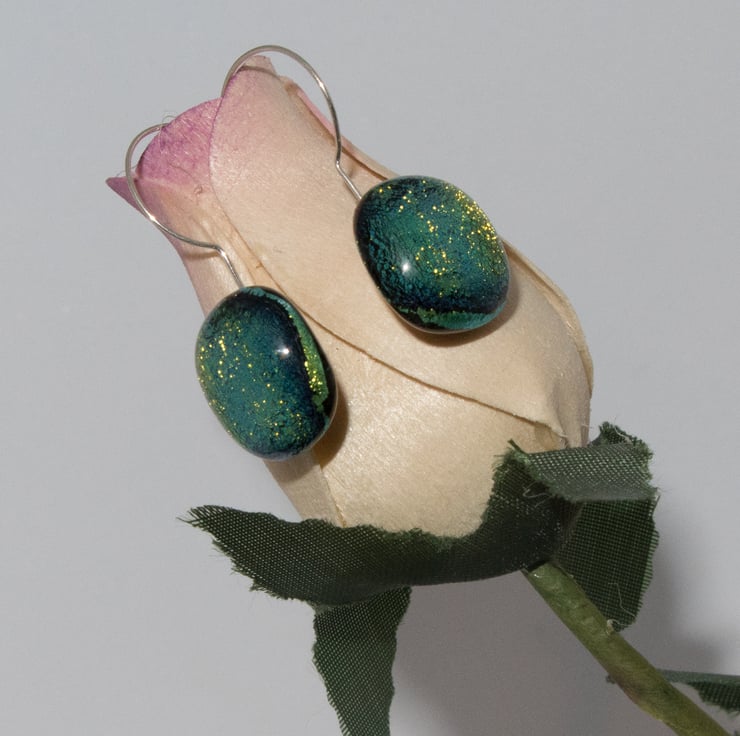 This pair is sparkly green, but if the light catches them right they can show other colours. wires are Sterling Silver. They will be shipped in a black presentation box.