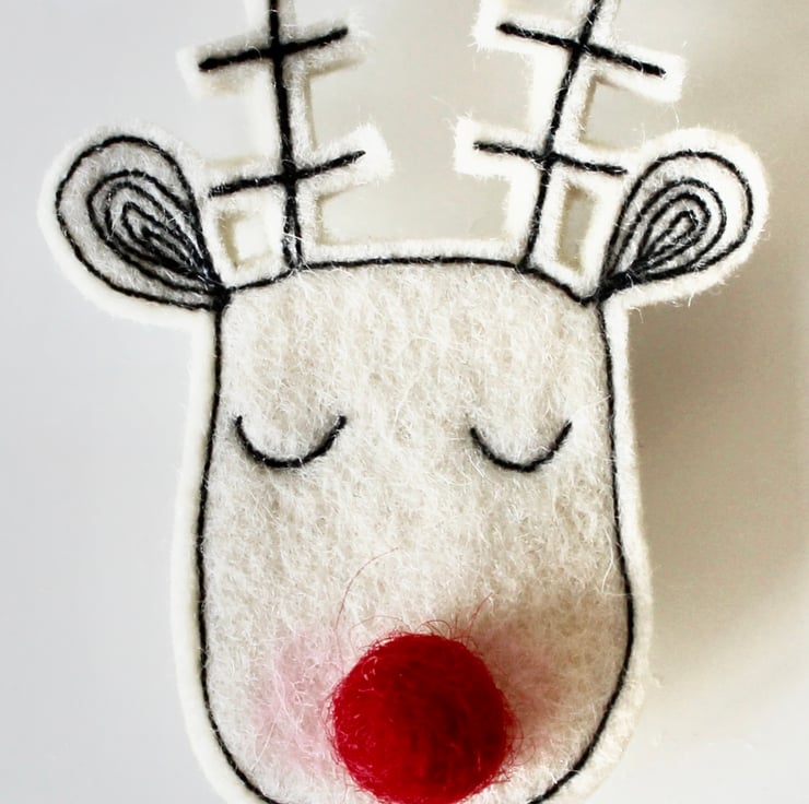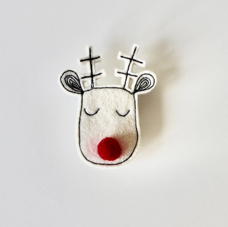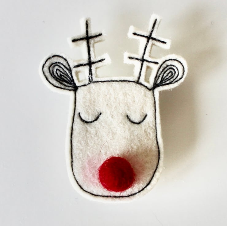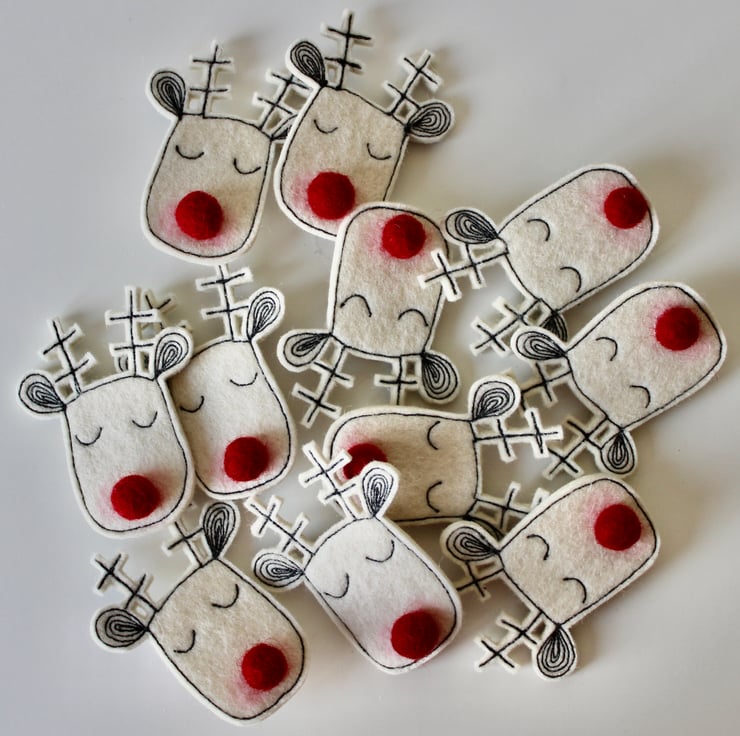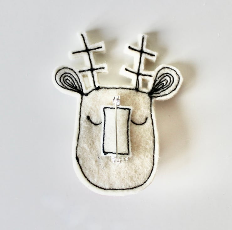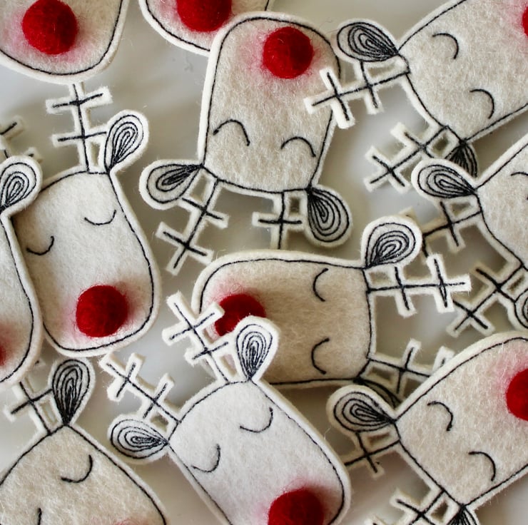 Reindeers are sewn using 100% wool felt and free hand machine embroidery; multiple layers of cloth are sewn together and cut out by hand using sharp scissors. They have a wool felt ball for a nose and the pins on the back are attached with hot glue, with a sewn fabric rectangle to secure.