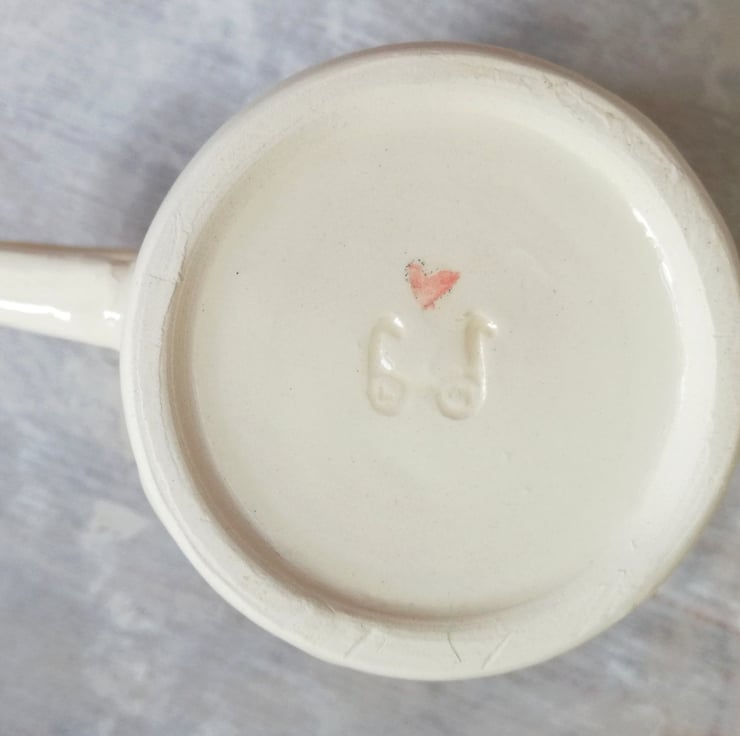 A fun handmade cup thrown on my wheel. 2 tiny modelled robins are added to the handle with footprints on the cup and 2 small red hearts painted inside