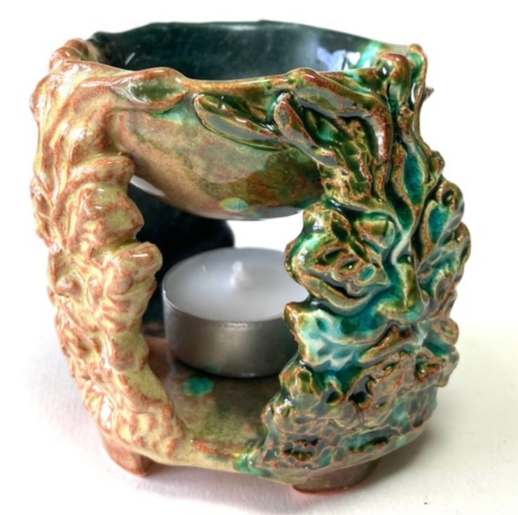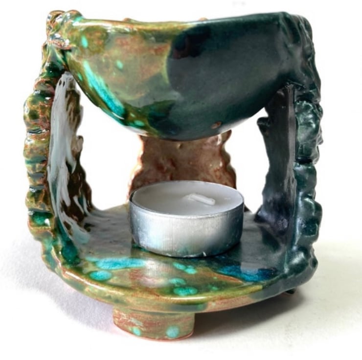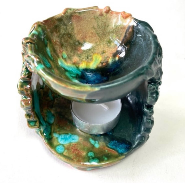 Three earthenware Green Man images from my own original design, glazed in seasonal colours. The base with feet to protect your furniture, supports a tealight/nightlight which warms the bowl.