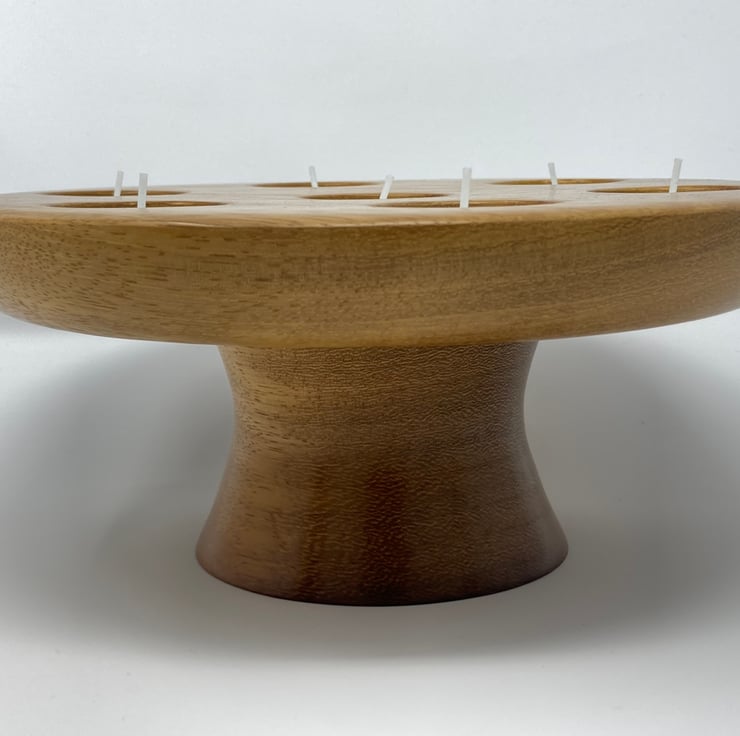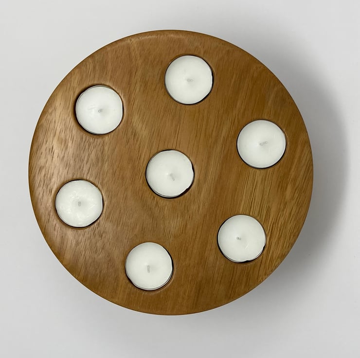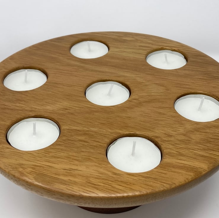 This tea light candle holder has been handmade on our woodturning lathe. The piece is made from Iroko, an African hardwood. It stands just under 10cm tall and 23cm diameter and can hold seven tea light candles safely spaced apart, ideal for a table centrepiece.