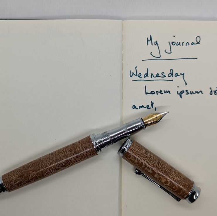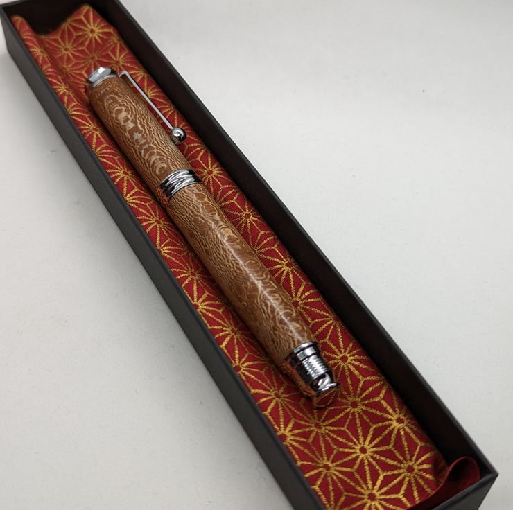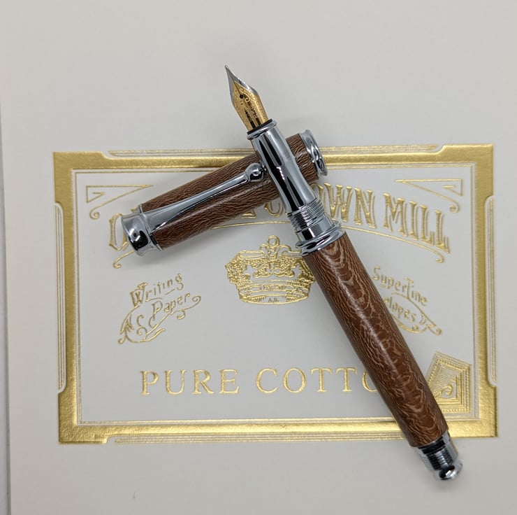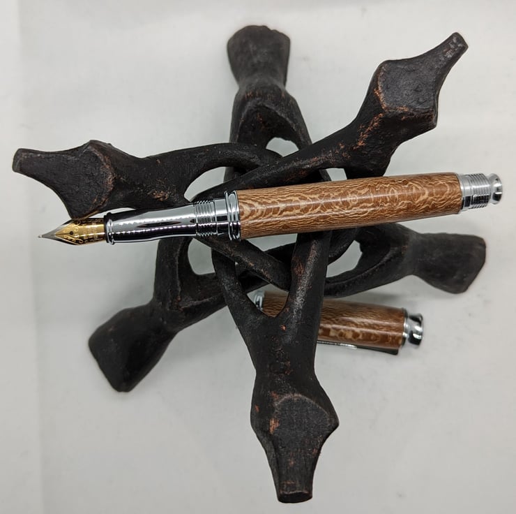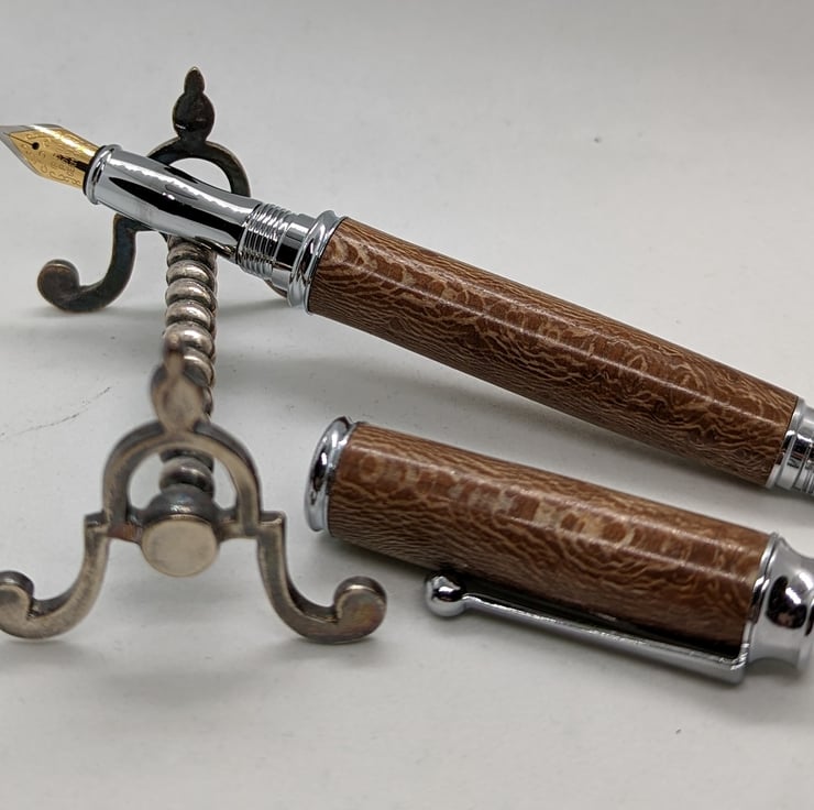 A hand turned fountain pen in London Plane. It is the most common and important tree in London and has an attractive golden-brown colour with dark brown flecks. This pen has additional speckling to add interest to the appearance. This is a high quality, well-designed pen with chrome metal parts that complement the colour of the wood. It has a converter to allow the use of bottled ink, it will also take standard cartridges and one will be supplied with the pen. It will be supplied in a material lined card box with one cartridge to get you started. F255
