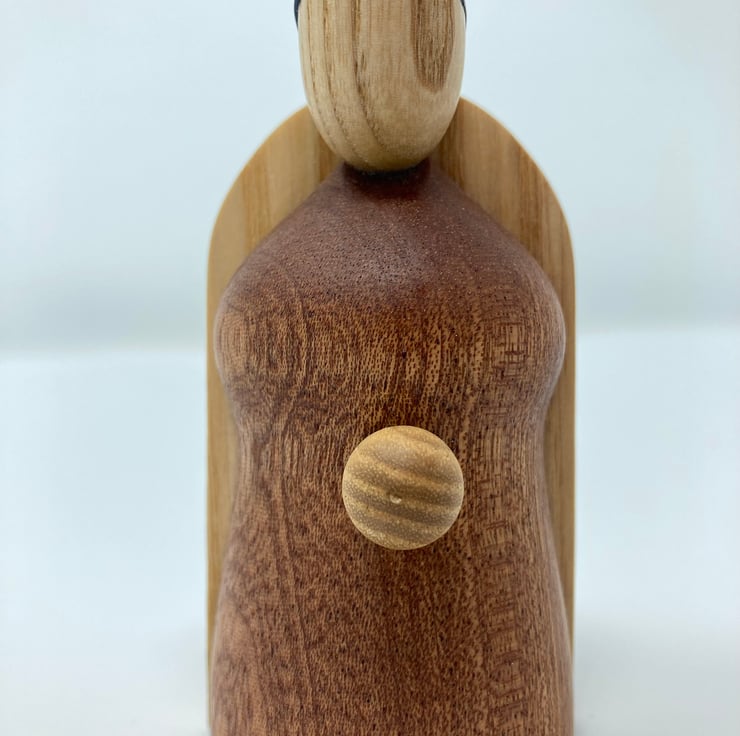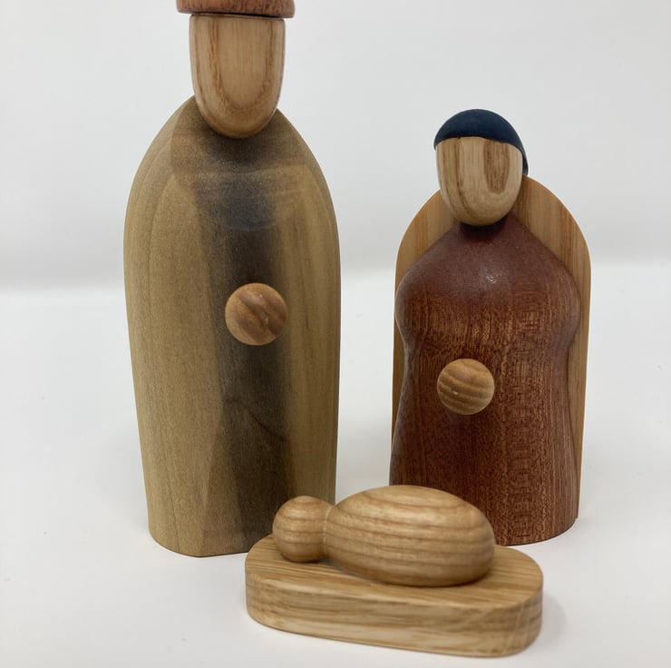 This decorative nativity scene has been handmade on our woodturning lathe. The scene contains Mary, Joseph and Baby Jesus in a crib. We have used a number of different timbers for this set, they include Oak, Ash, Sapele, Beech and Tulip.