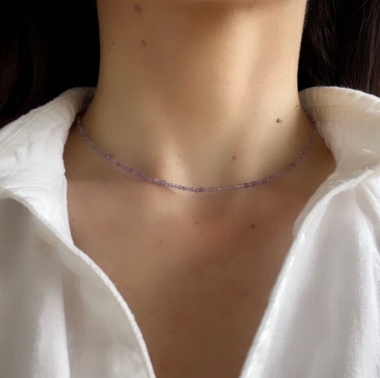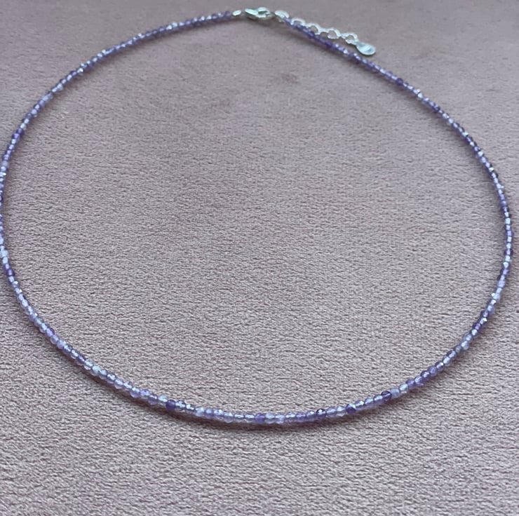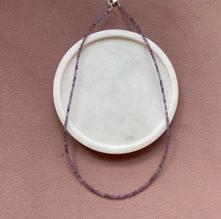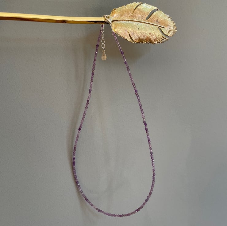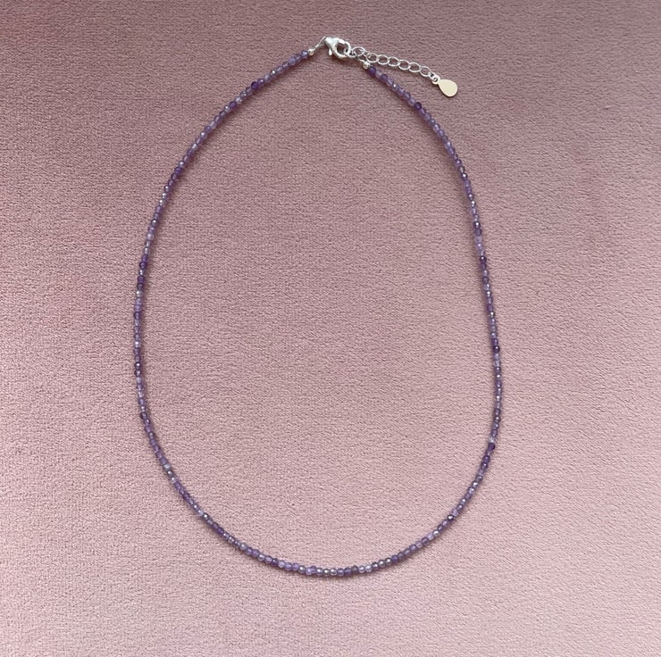 Handmade natural amethyst faceted crystal beaded necklace, 2mm beads, with 925 sterling silver lobster clasp and extender chain