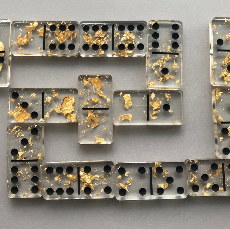 Beautiful full set of 28 gold leaf clear resin dominoes with black details. comes with organza bag for storage.