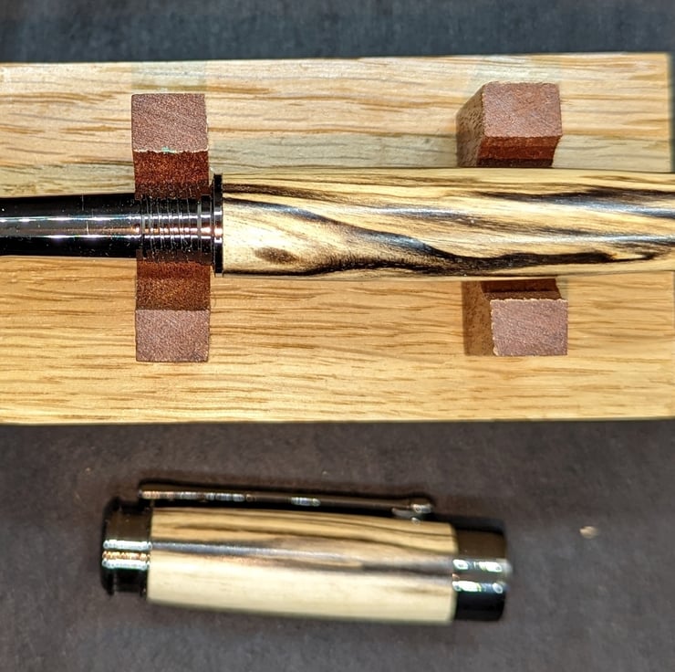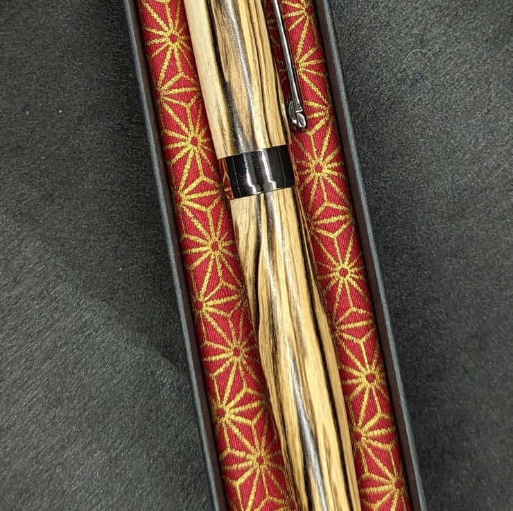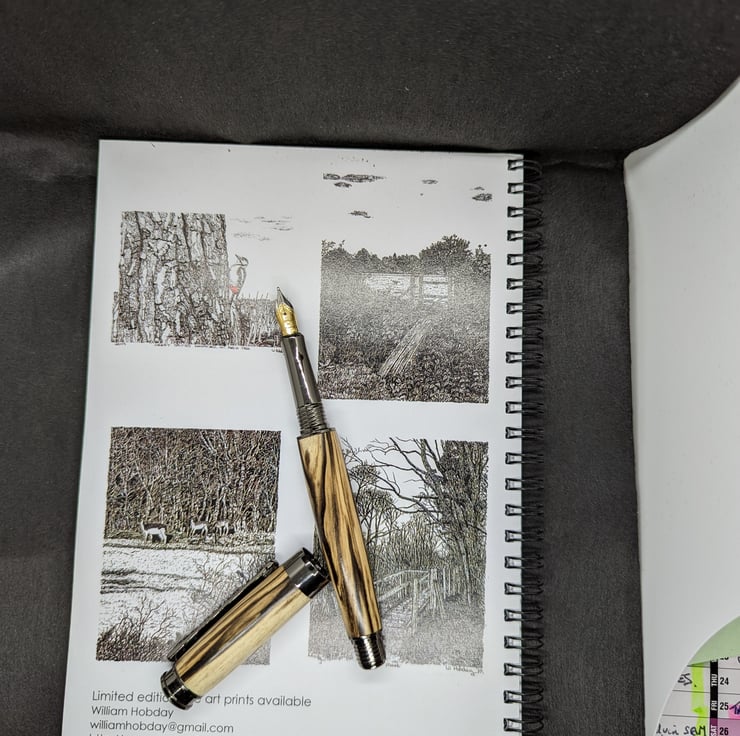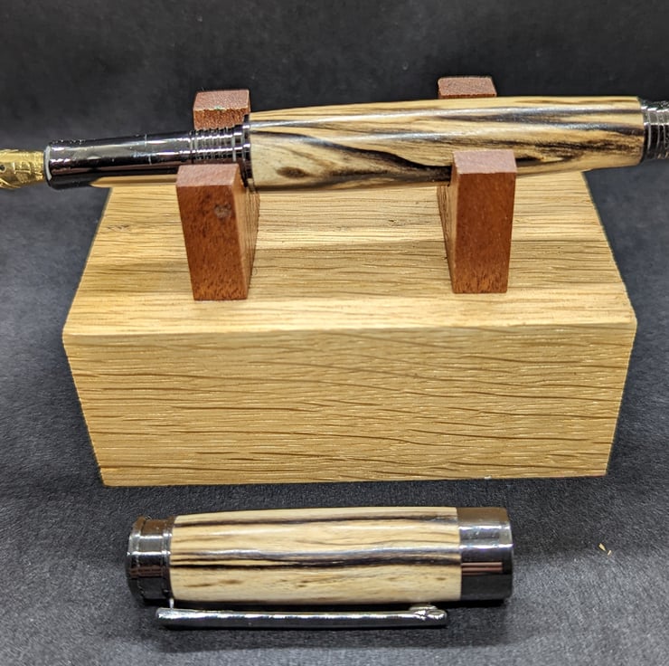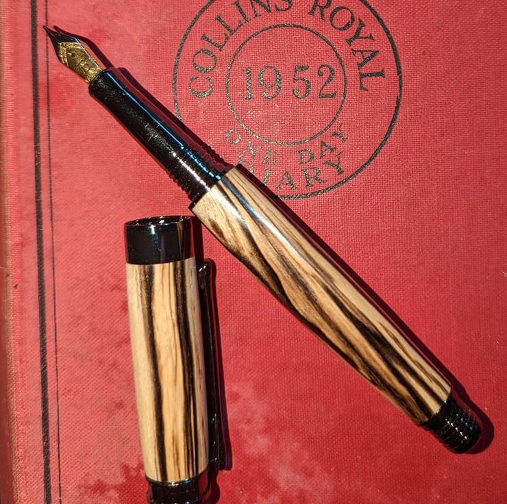 A hand turned fountain pen in Spalted Hornbeam. Native to the south of the UK, gnarled and mighty, the hornbeam is as tough as they come. Romans used hornbeam to make their chariots because of the strength of the wood. This is a high quality, well-designed pen with gun metal parts that complement the colour of the wood. It has an upgraded German Beaufort premium nib and converter, it will also take standard cartridges, one of which will be supplied and it will be packaged in a material lined card box. F277