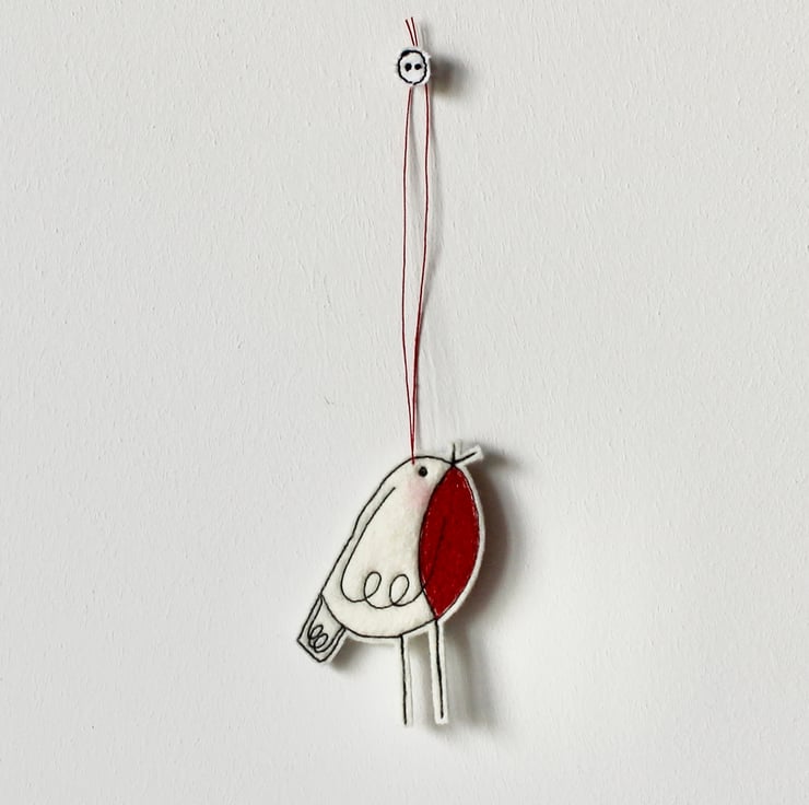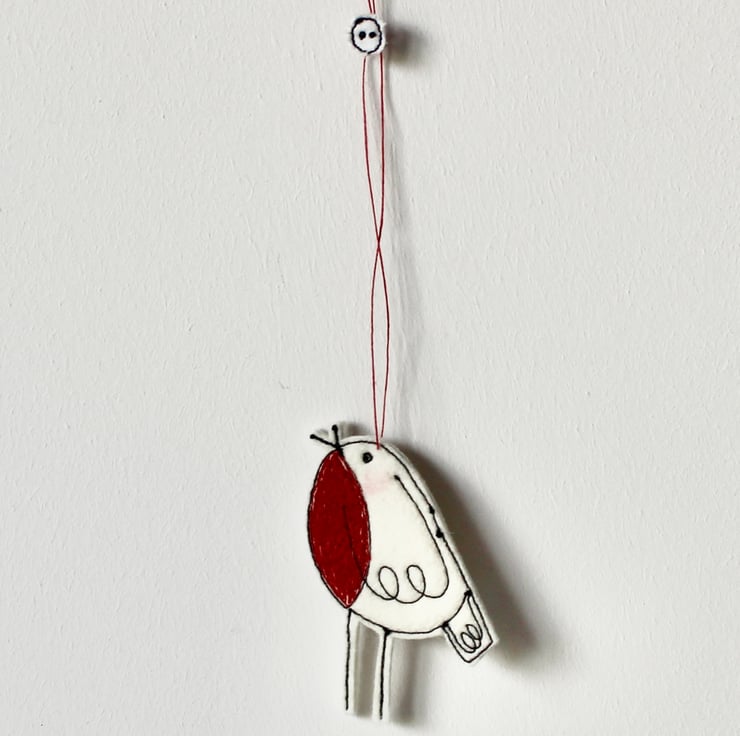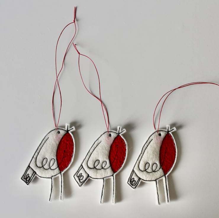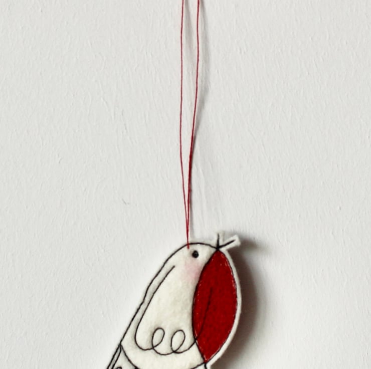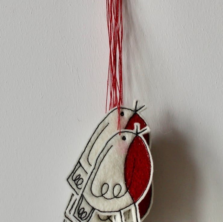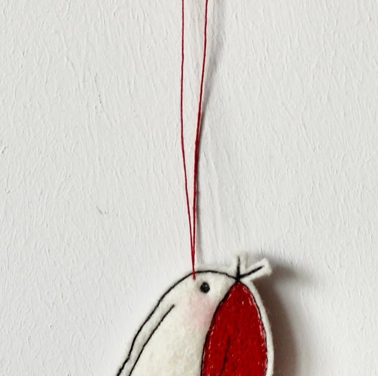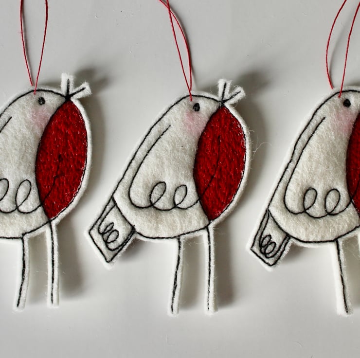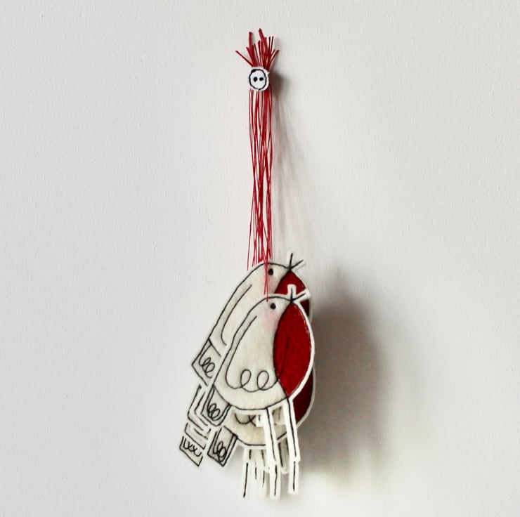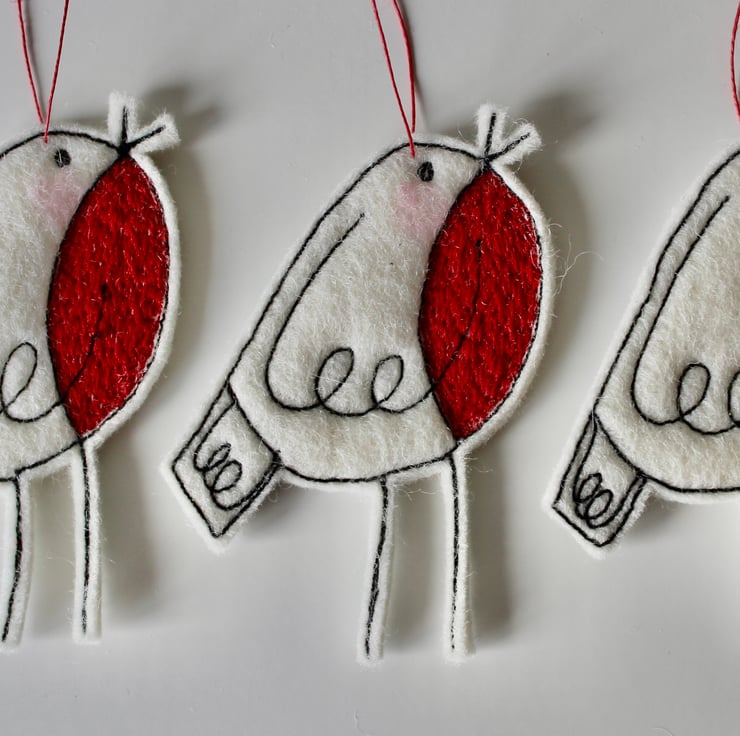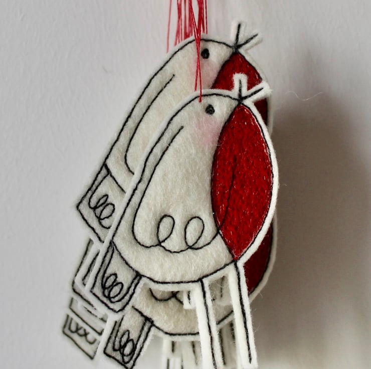 Delightful hanging decorations which are created using 100% wool felt, free hand machine embroidery and cut out by hand, using a very sharp pair of scissors.