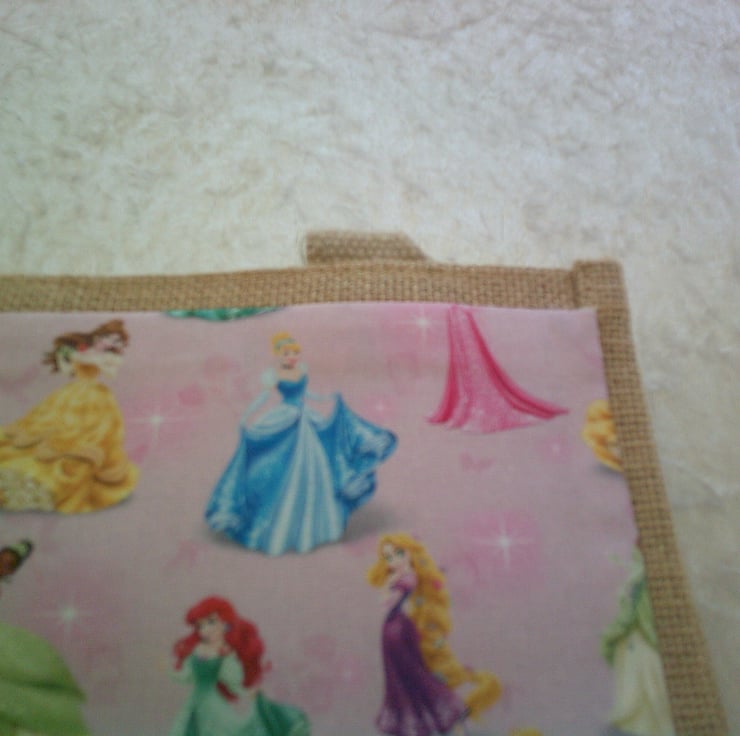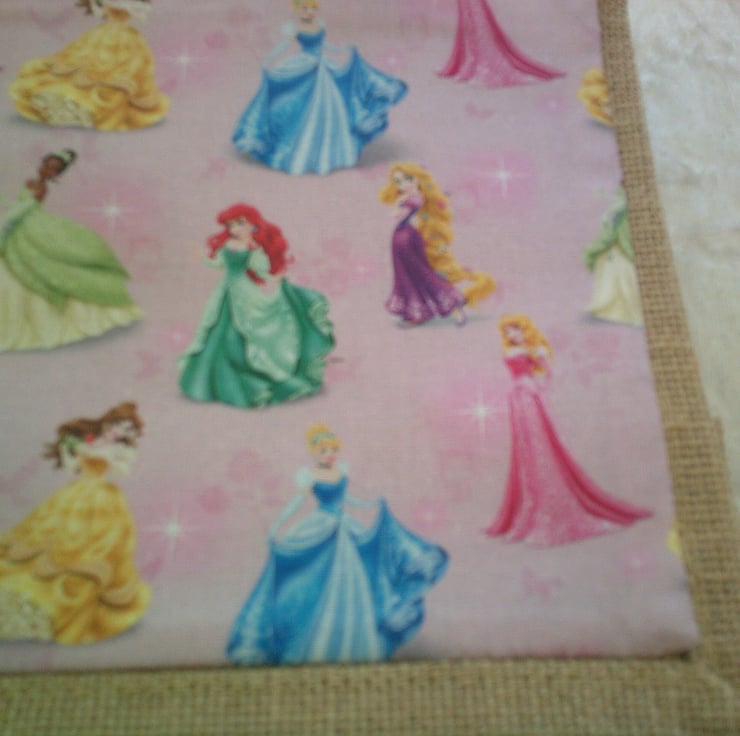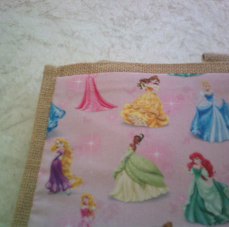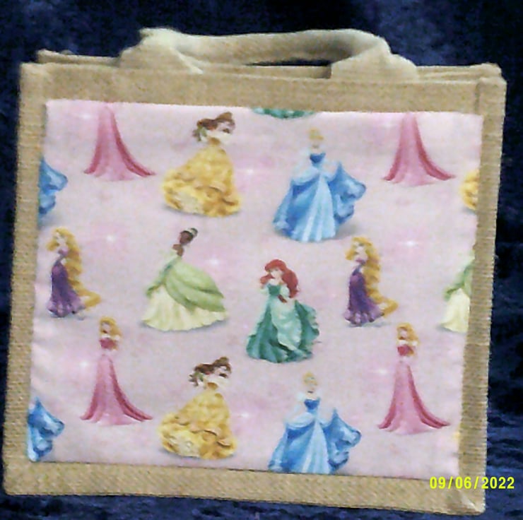 The bag itself measures approximately 22 x 20 x 13 cm (9 x 8 x 5 inches). The fabric pocket - which has been hand sewn onto the bag has a design of various Princesses including Cinderella, Belle, Princess Tiana and Aurora on a pale pink background.