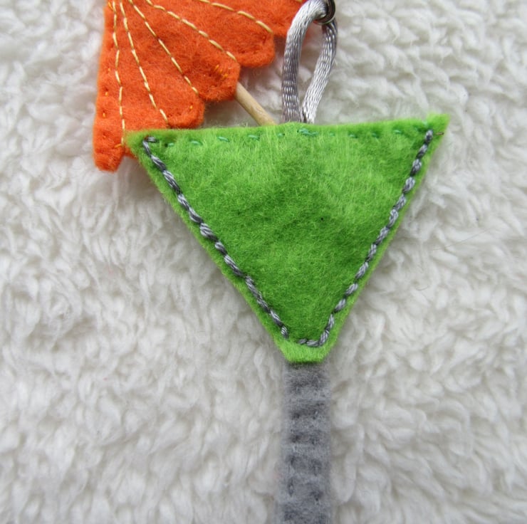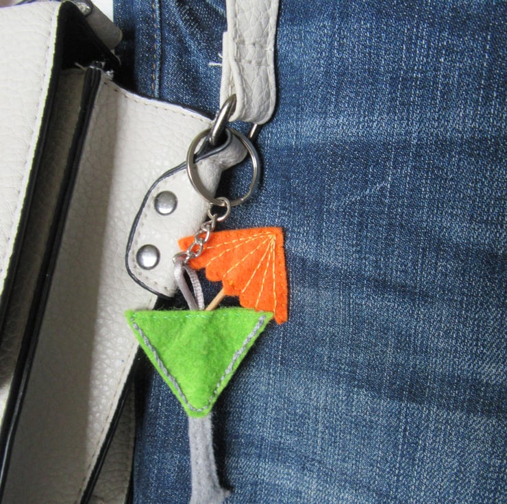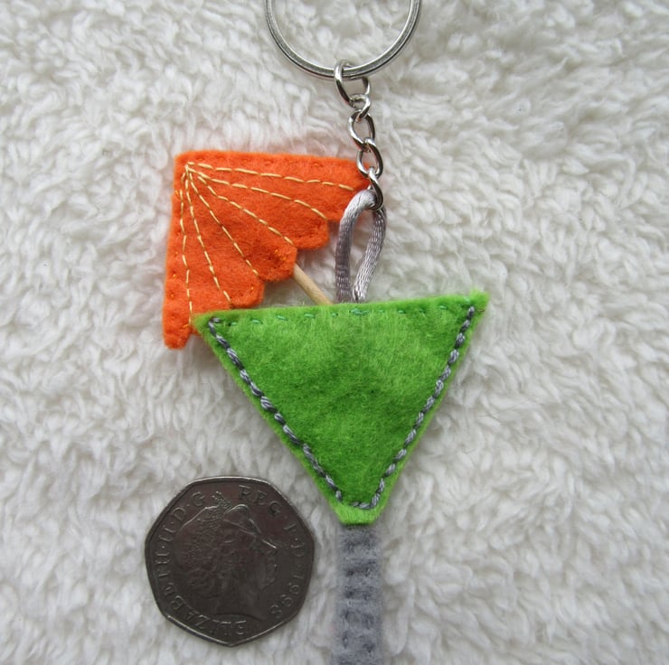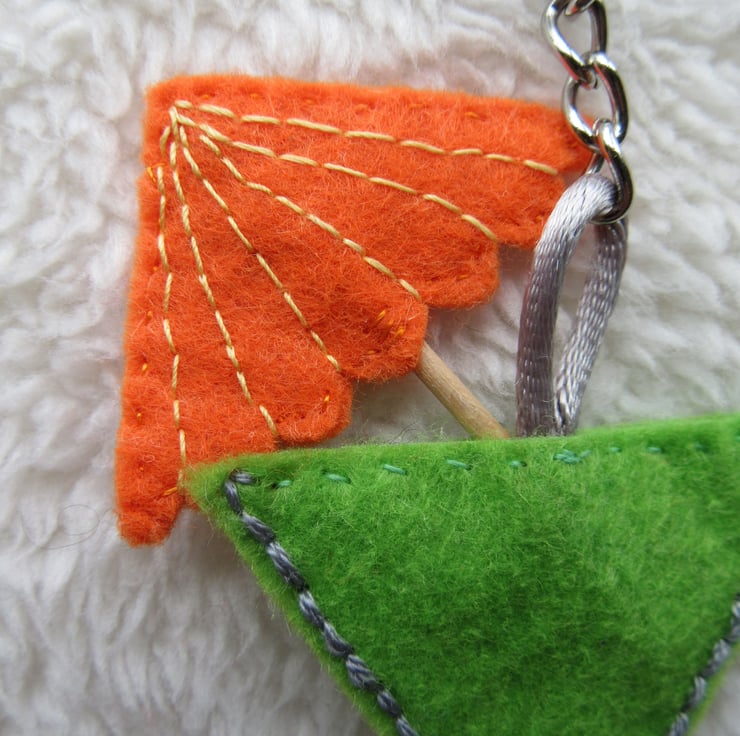 This keyring is hand stitched from felt, the glass is green, with a grey stem. There is an orange umbrella with a cocktail stick handle. It is attached to the metal keyring with a strong silver cord.