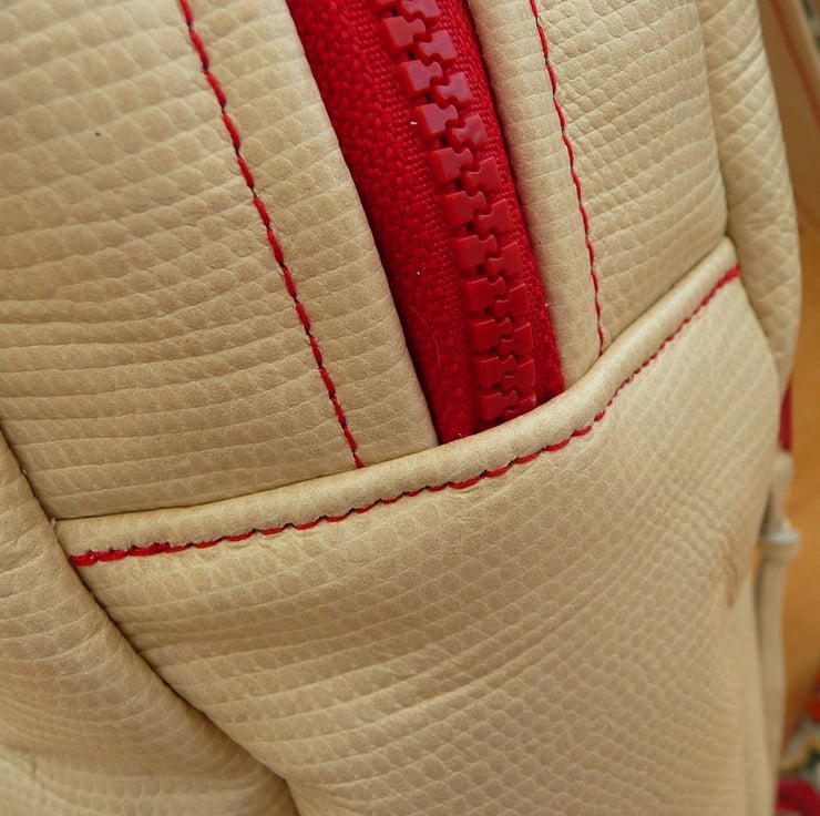This backpack / rucksack is my own design, this one is made from cream leather and indoor / outdoor fabric. This rucksack features red top stitching, a red top zip opening, a large slip pocket on the front with a magnetic snap fastener, a red zip pocket on the back, a leather & fabric carry loop, and leather and fabric adjustable shoulder straps. Inside is fully lined in red cotton canvas andd has a slip pocket and a zip pocket.