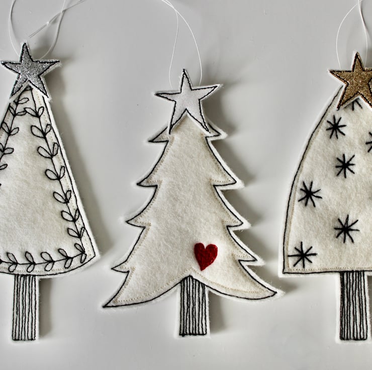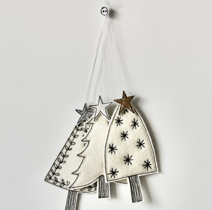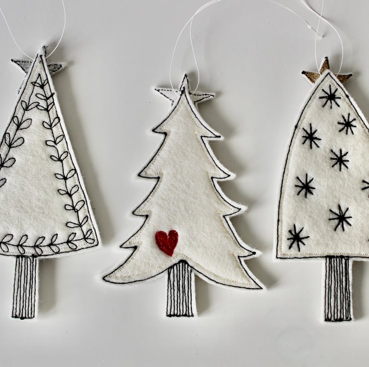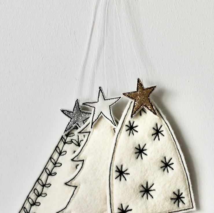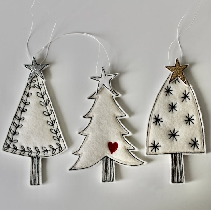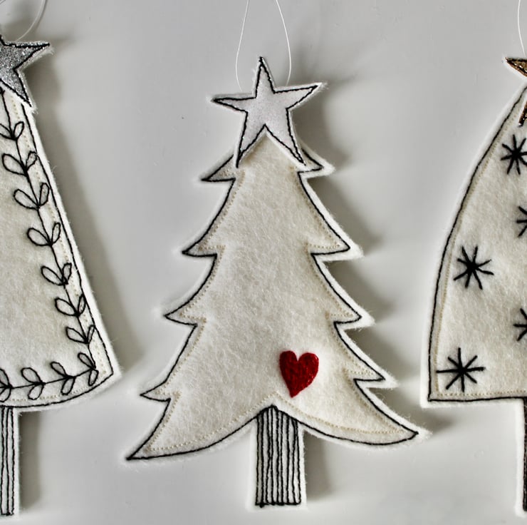 Delightful hanging decorations which are created using 100% wool felt, glitter cloth, free hand machine embroidery and cut out by hand, using a very sharp pair of scissors.