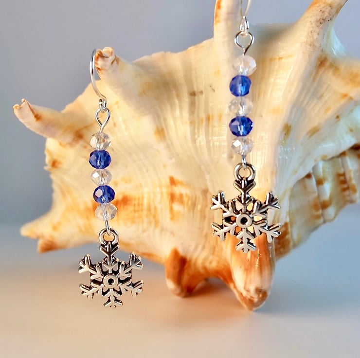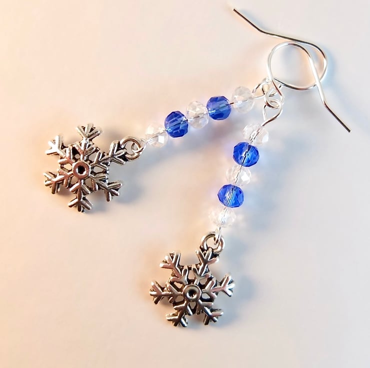 Simple but sweet little snowflake charms of Tibetan silver, measuring approximately 13mm, topped with sparkly glass beads in clear and ice blue, all hung from silver plated ear-wires.