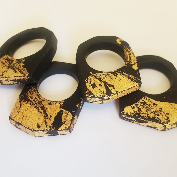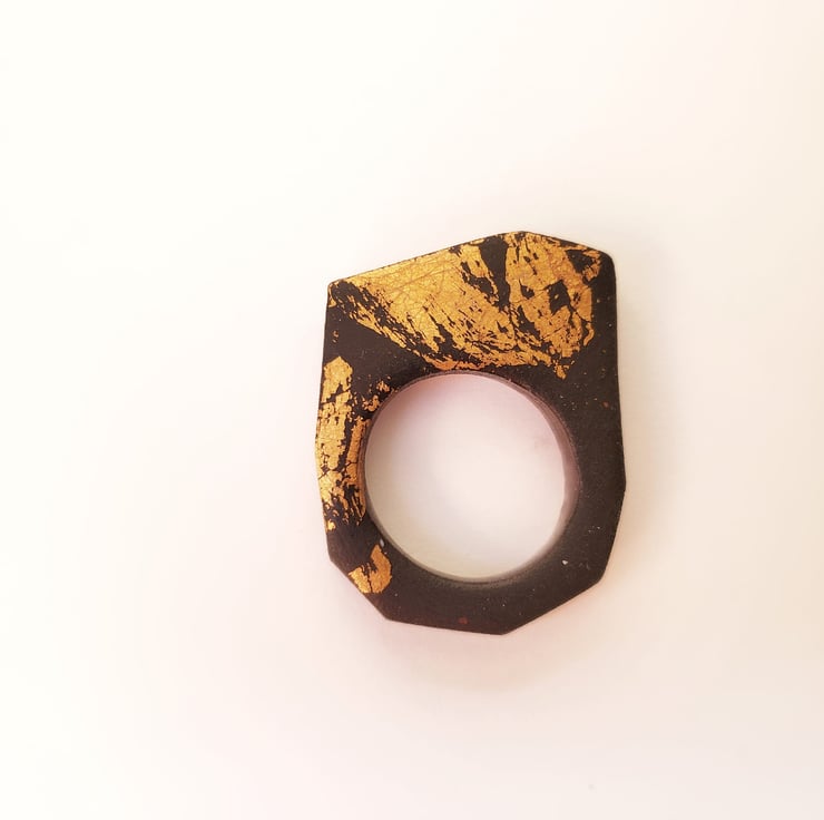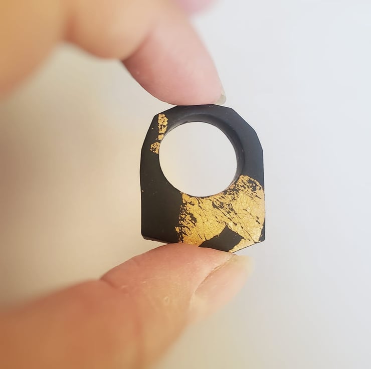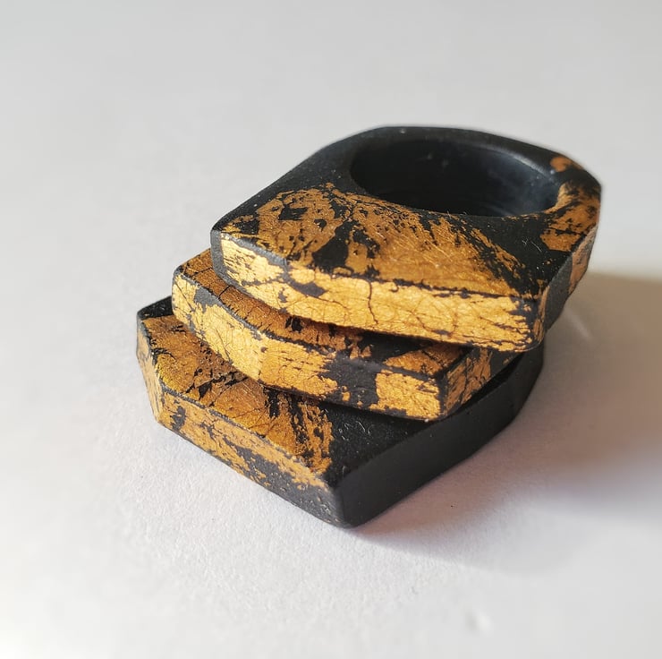 Contemporary and bold, these rings stand high on the finger and really stand out. Each of my Wabi-Sabi rings is unique and individually handmade, no two are alike. I have designed them to be imperfect and distressed, with an ‘aged’ feel, I wanted them to retain a feel of the hand of the maker. I love the drama of the black and gold leaf together, reflecting my admiration of antique Japanese lacquer boxes.
