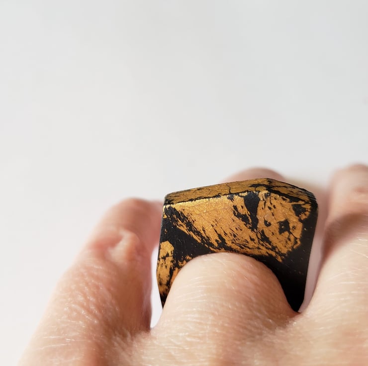 A dramatic chunky statement ring inspired by the Japanese concept of Wabi-Sabi in black and gold.