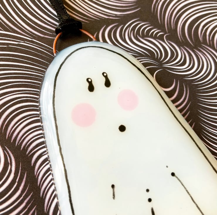 Made from opaque white glass, the ghostie does have a lovely translucency to it...it has pale pink cheeks and black line detail which is fully fused onto the piece, it won't scratch off.