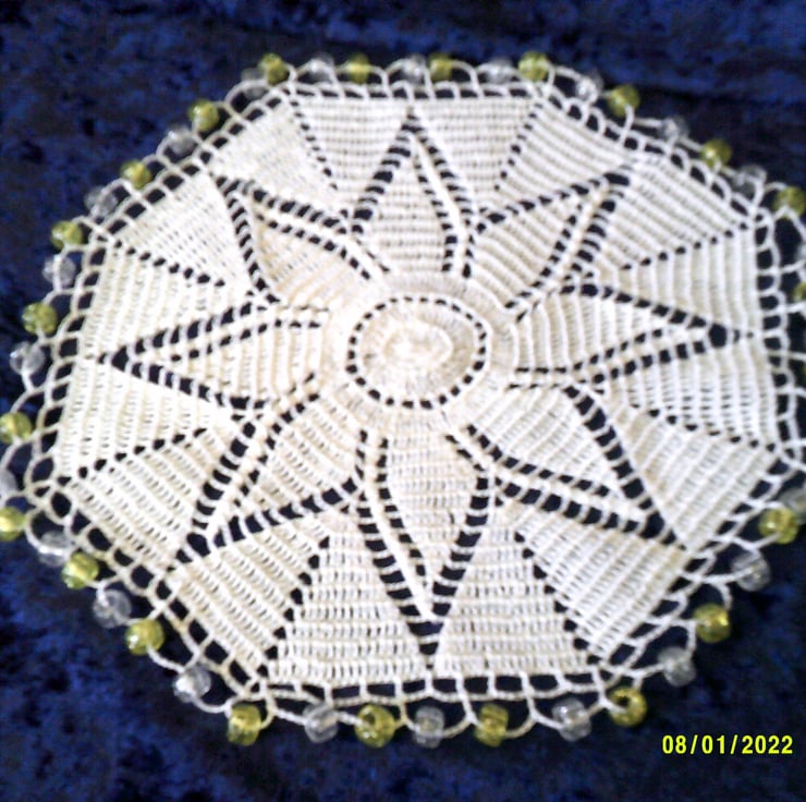 The design is of what looks like a large flower within treble crochet with chain loops around the edge.