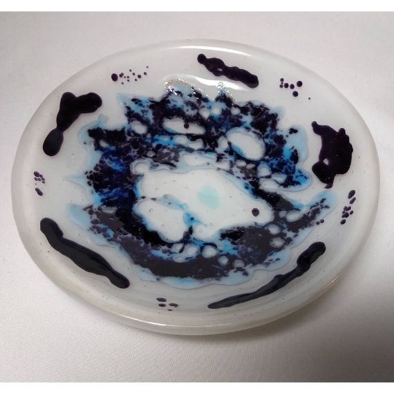 This interesting dish is created a base layer of white, with details formed from fused purple and blue coloured glass, then fused together and slumped into a bowl.