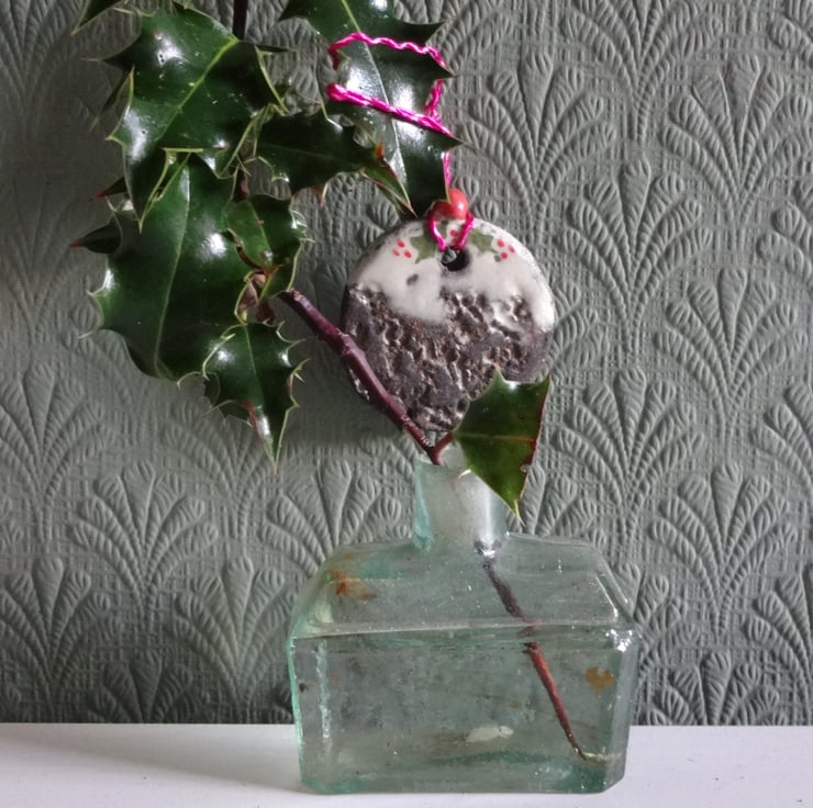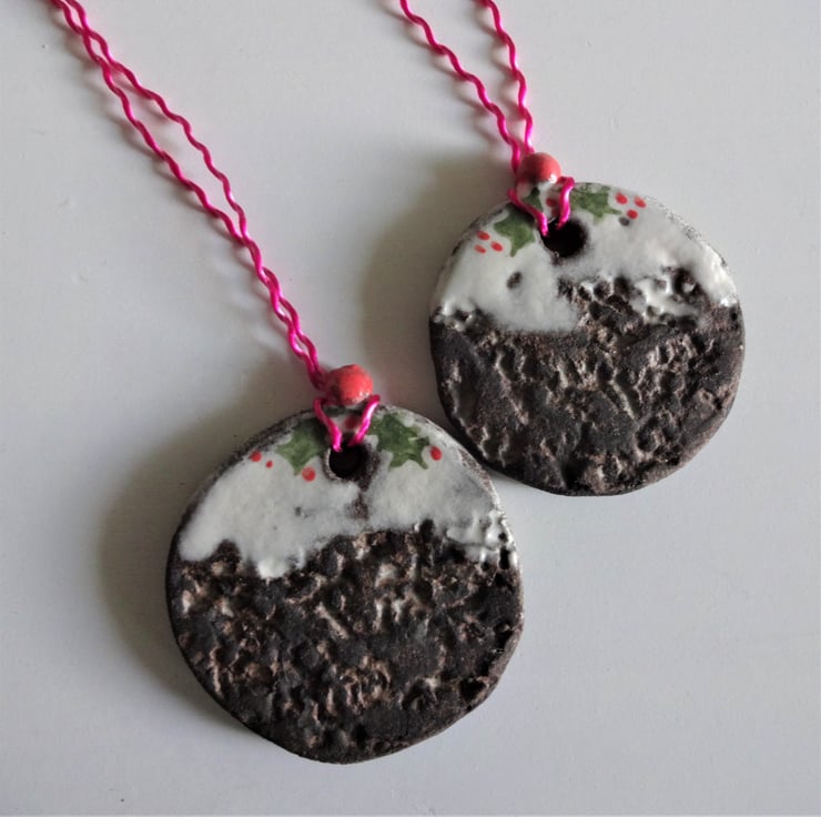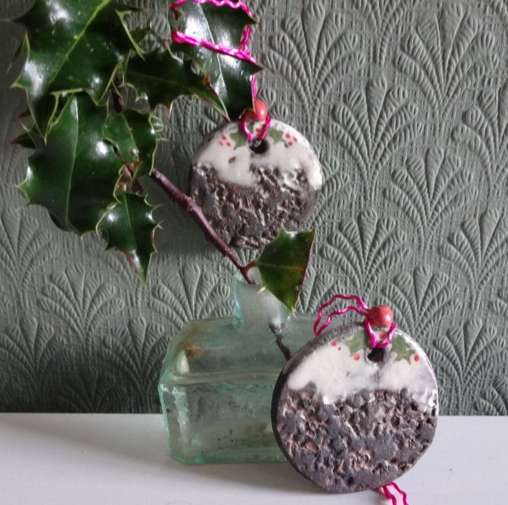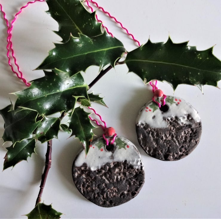 These handmade ceramic Christmas puddings topped with a cherry will make lovely tree ornaments, or can be used to make a very personal and special gift box trim or stocking fillers. I made the puds from a shaped disc of soft clay, texturing the surface and then using coloured slips to make white sauce, holly and berries. The front surface is glazed, but the reverse is the plain black of the natural clay after firing. I’ve finished them with a bright pink wiggly cord to tie on your tree or attach to gift wrap. Just the thing for a jolly Christmas celebration! Forget planet-unfriendly plastic ornaments, these ceramic puds will last for years! 5.5 cms diameter and 4.5cms diameter with 14cms cord length. Please keep away from young children as they may think the puddings are good enough to eat!
