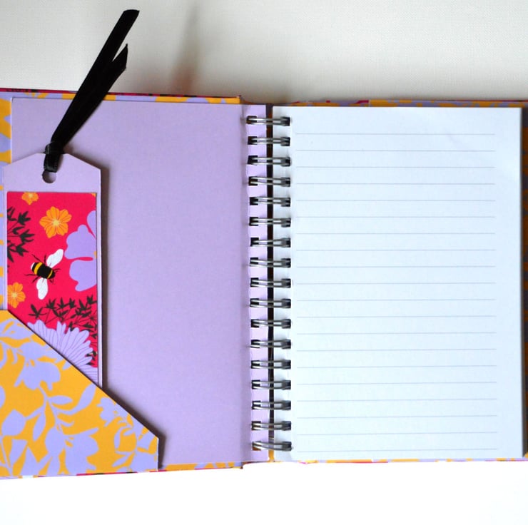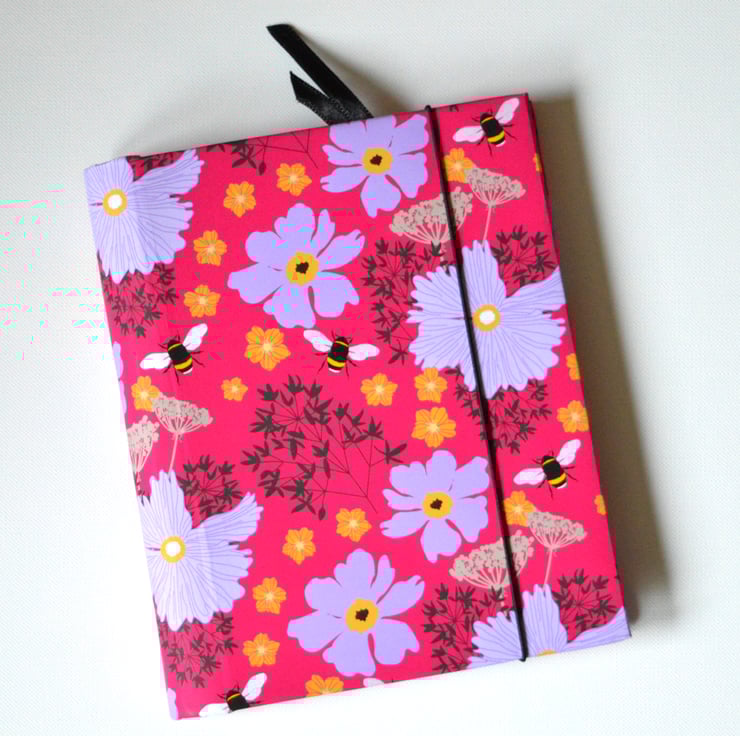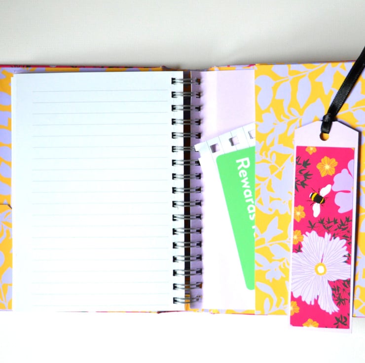 This handmade notebook journal features a floral bumblebee pattern I have created using Adobe Illustrator, to decorate it on the front cover with harmonising colours and patterns on the inside. It has an expandable pocket in the back inside cover, handy for you to keep small important papers in such as receipts etc. and comes with a matching handmade bookmark with ribbon decoration which tidily slots in a corner front inside pocket.