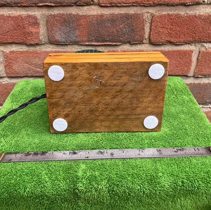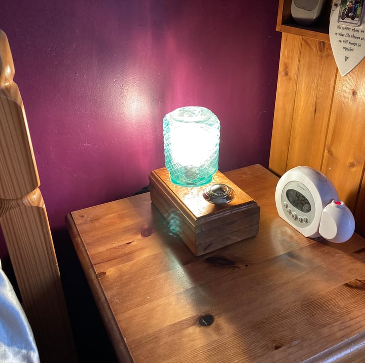 A quirky and unique pair of bedside lamps made entirely from upcycled items – except, of course, for the new electrical components. I have used reclaimed wood bases to mount a pair of teal - turquoise, moulded screw top glass mugs containing dimmable LED bulbs which are switched by touching a polished brass doorknob; touch once to switch on dim lighting, touch again to brighten, touch a third time to full brightness and once more to switch off.