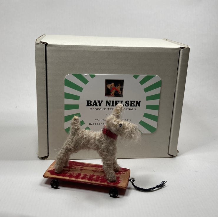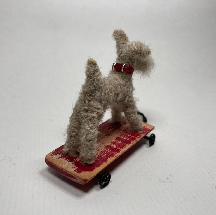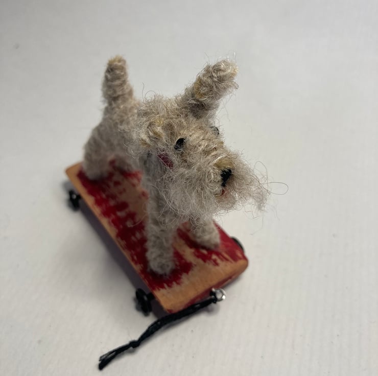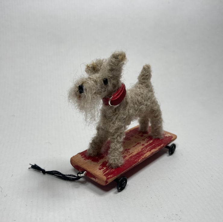 OOAK sculptured miniature dog on a pull along wooden trolley with wheels. All my animals are hand finished with eyes and noses and, if needed, wool whiskers! The wheels are for decorative purposes only and do not turn.
