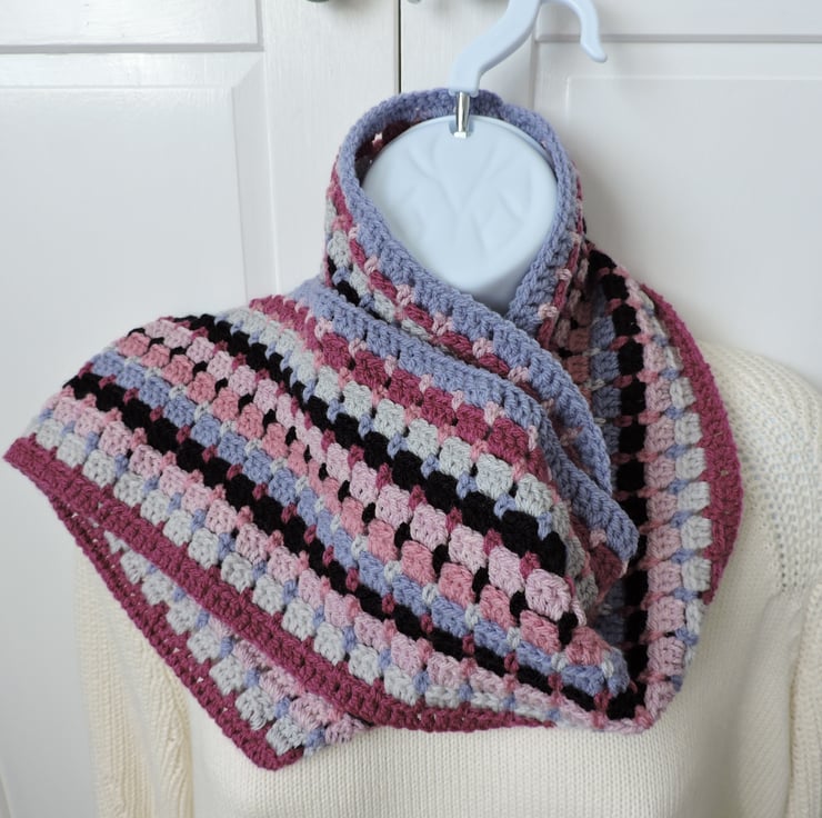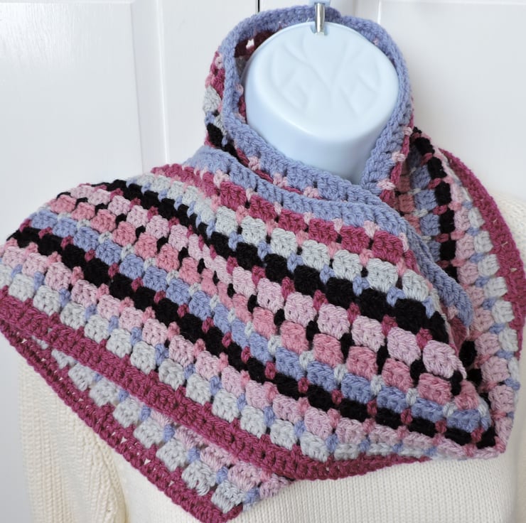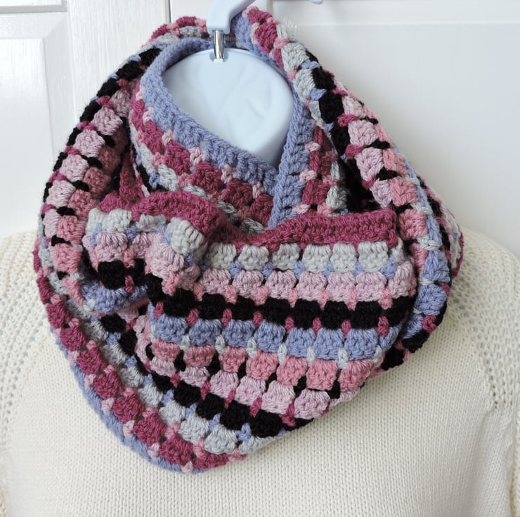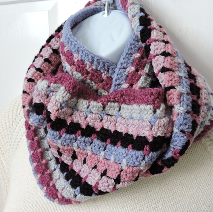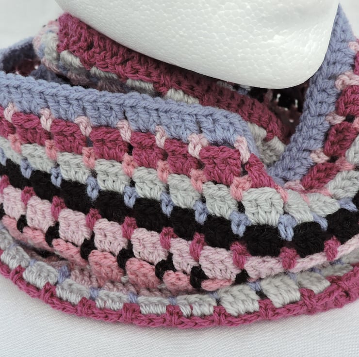 Seconds Sunday clearance item. I've crocheted this adults infinity scarf using an acrylic double knit yarns. Colours are pale pink, rose pink, deep pink, black, bluebell blue and pale grey . A lovely winter warmer, wear it long or wrapped twice around your neck to keep you snug and warm. .