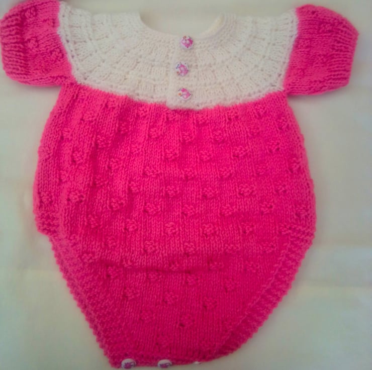 This lovely textured romper and hat set for a baby boy or girl is hand knitted in double knitting yarn. It would make an ideal Christening gift, a new baby gift or baby shower gift or it would make a lovely treat for your own little one.