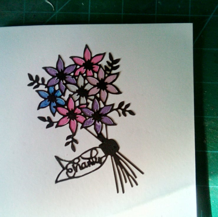 A completely handmade and uniquely designed card. Consisting of a beautiful bouquet of flowers die cut from black card. Mounted onto quality pristine white card. Hand coloured with gel pens