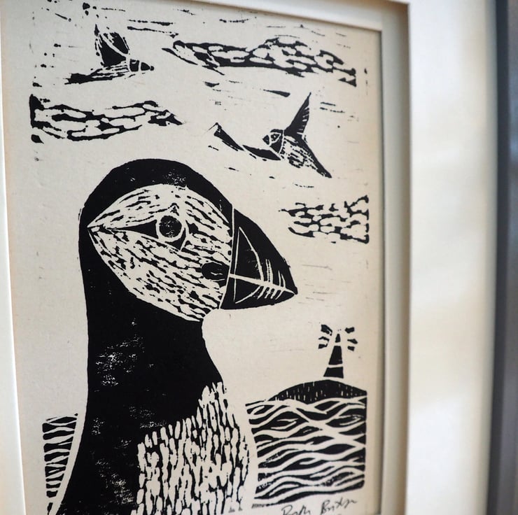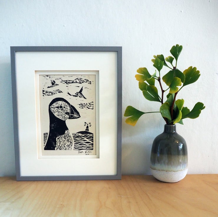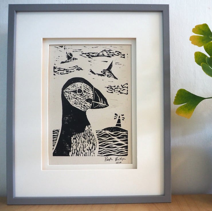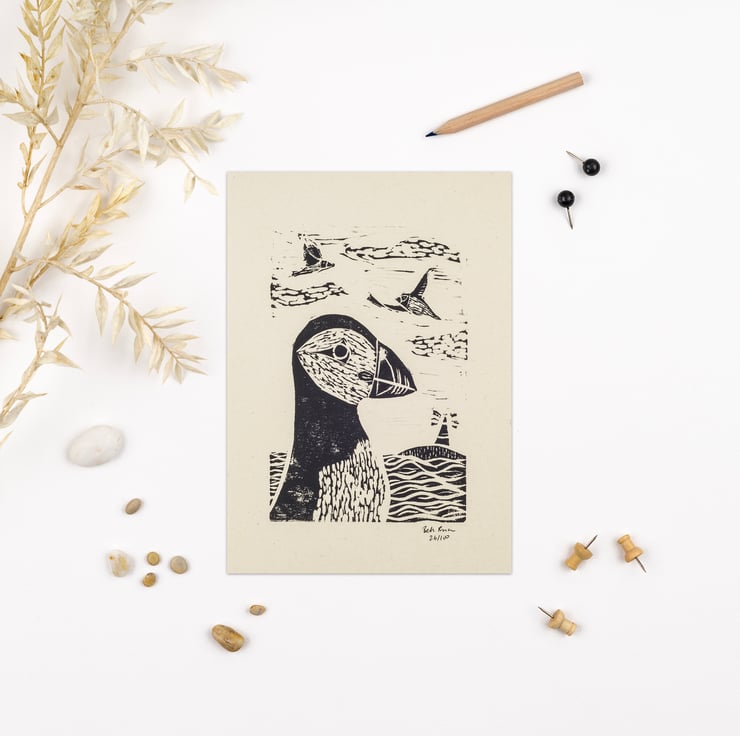 A beautiful one colour lino print featuring a beautiful Puffin near the sea. Puffins are one of my favourite birds and I will always remember seeing them in the wild in Iceland.