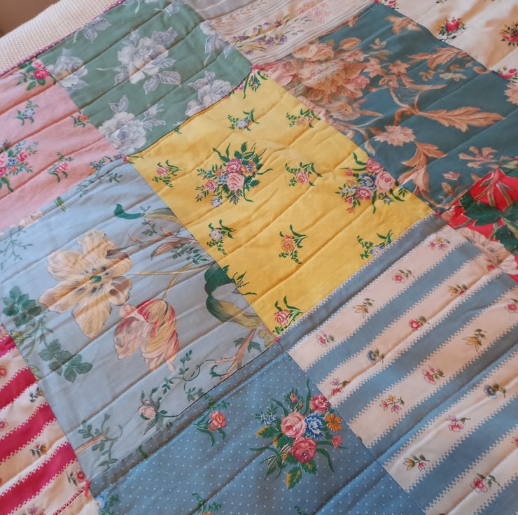 A gorgeous quilt made from vintage chintz fabrics. The patchwork was bought from a vintage fair and was just begging to be made into a quilt. The fabrics are all vintage chintz fabrics and beautifully soft.
