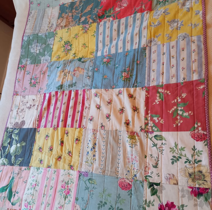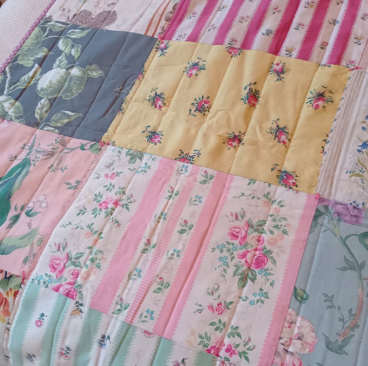 A gorgeous quilt made from vintage chintz fabrics. The patchwork was bought from a vintage fair and was just begging to be made into a quilt. The fabrics are all vintage chintz fabrics and beautifully soft.