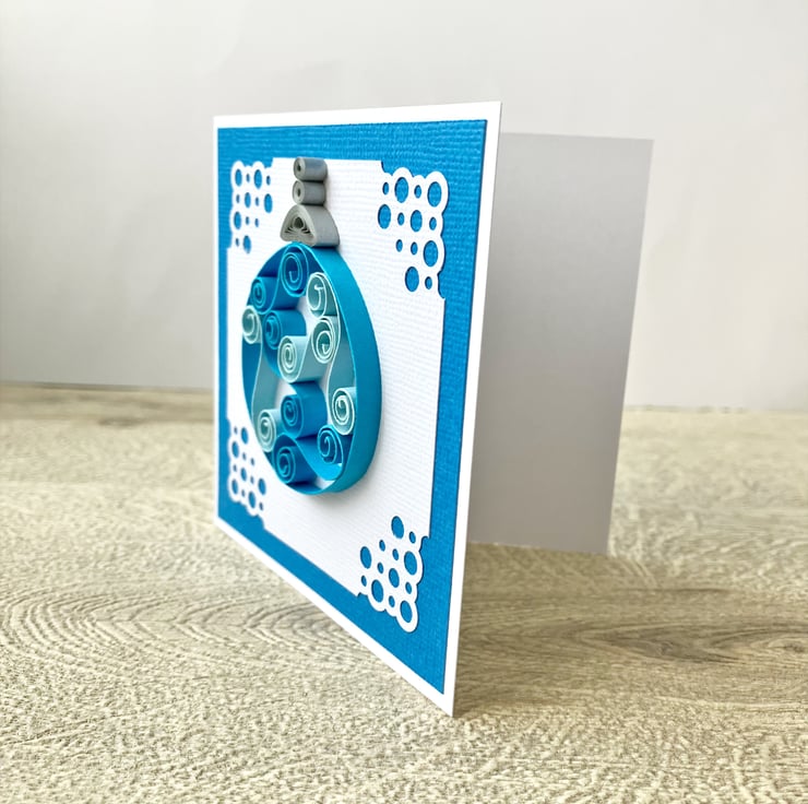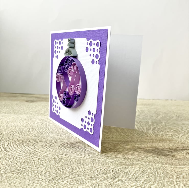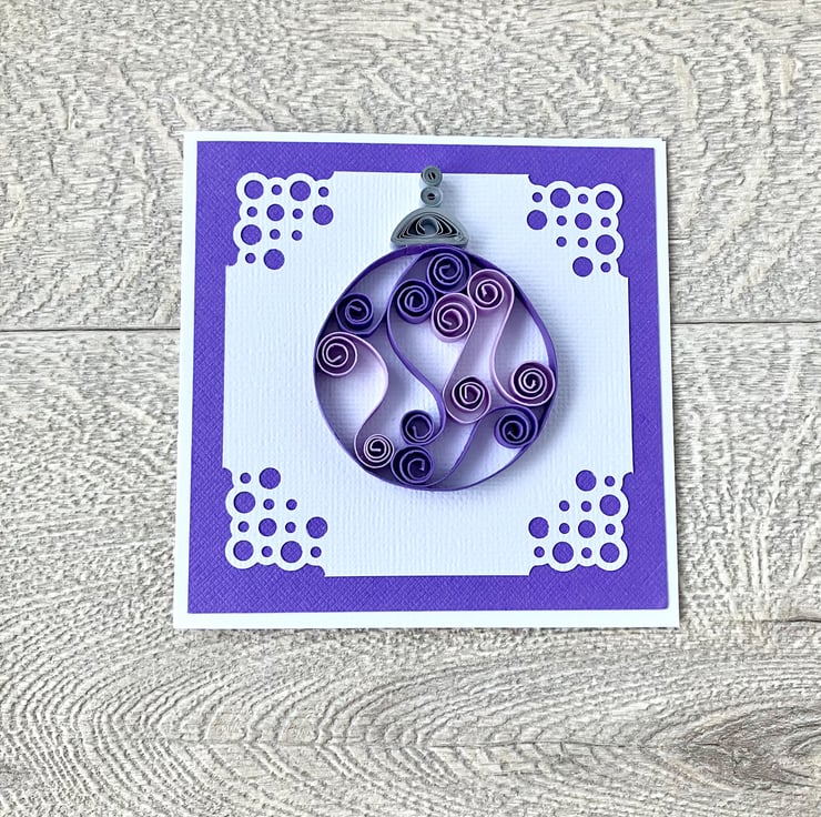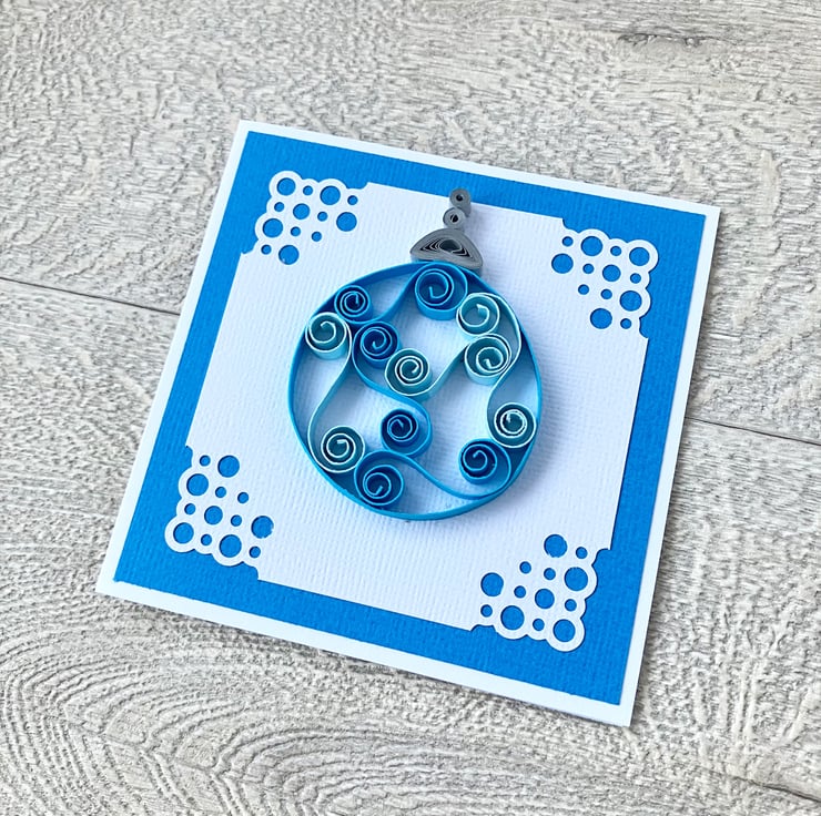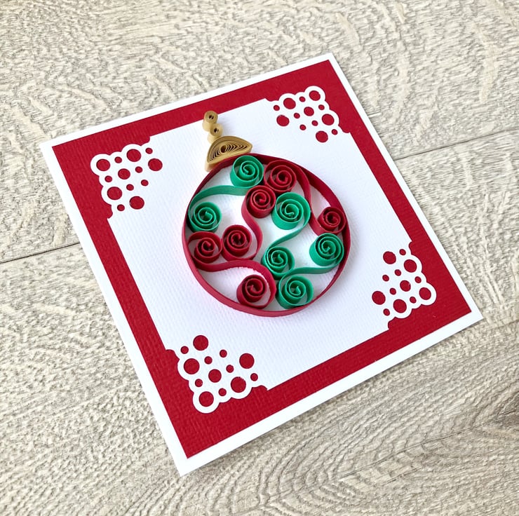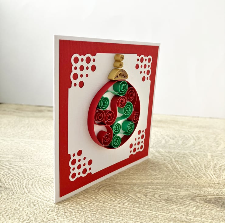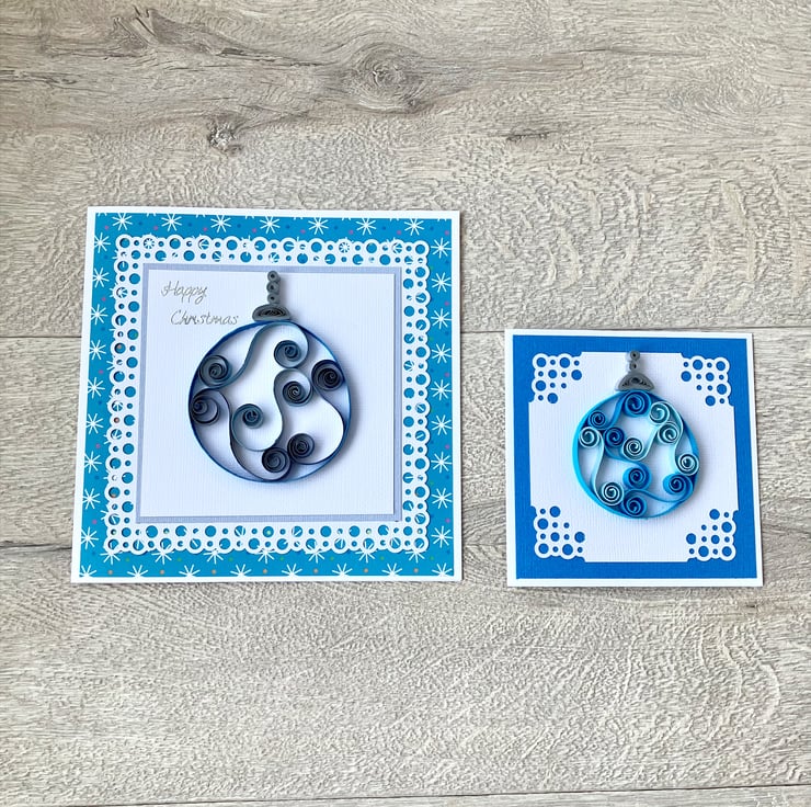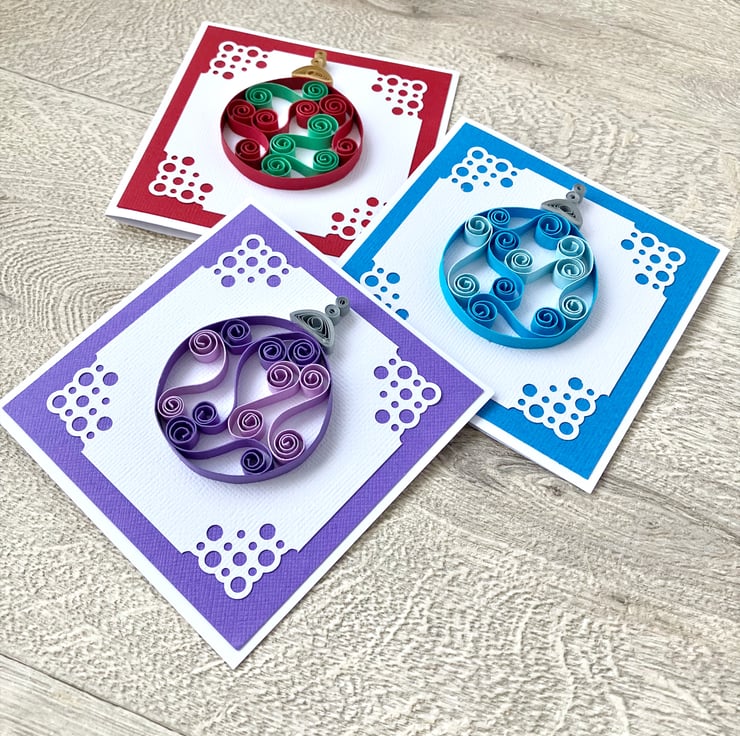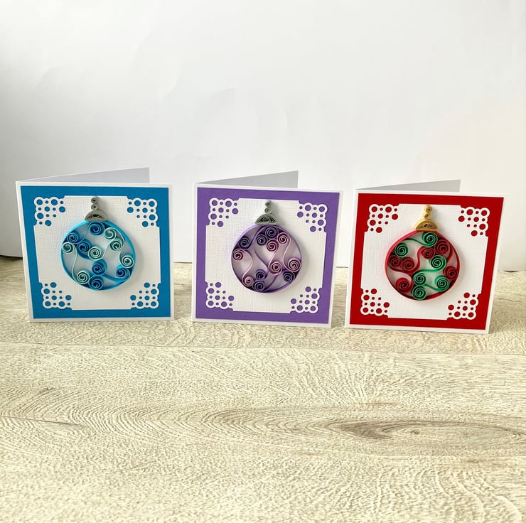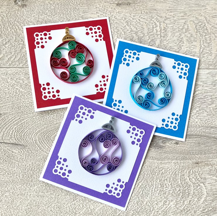 Each 250gsm card is 4 inches square (10cm approx) and features a quilled Christmas bauble in two colours. Tight coils of silver or gold have been used to create the effect of the top of the bauble hanging down. The bauble is on white textured card with a pretty corner design mounted on co-ordinating textured card.