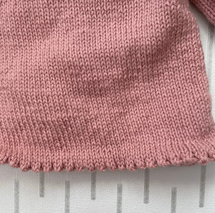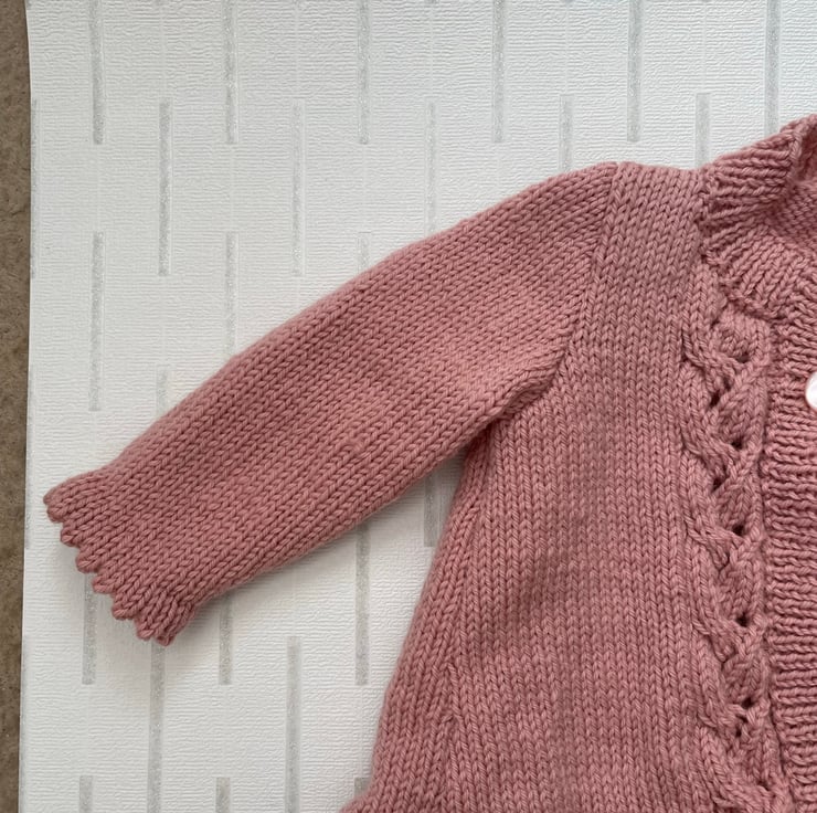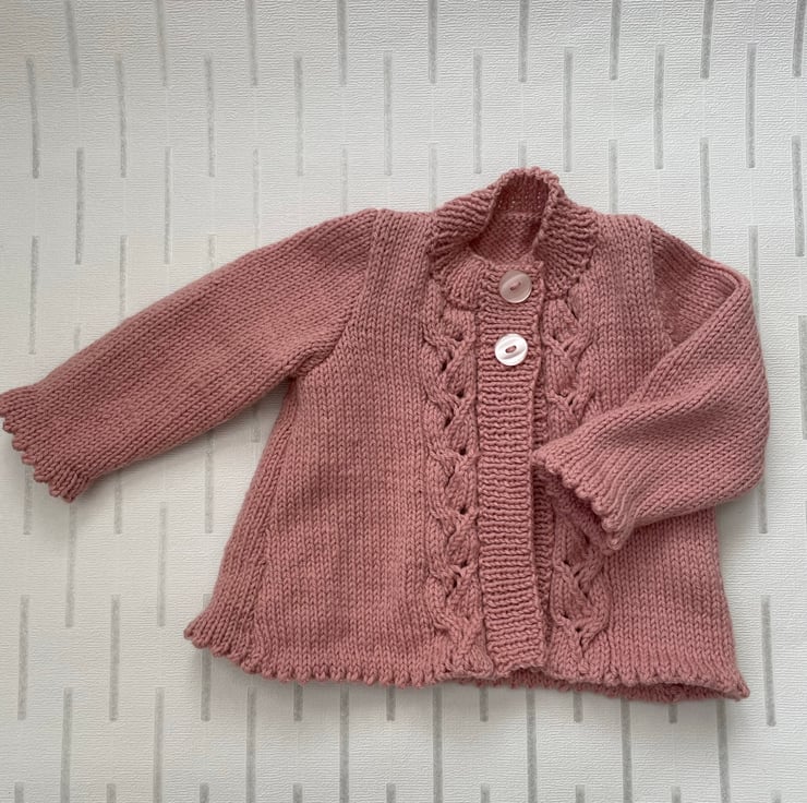 It has a picot edging round the bottom and also on the cuffs. A cable pattern runs up the side of the front ribbed bands and it fastens with two buttons at the top.