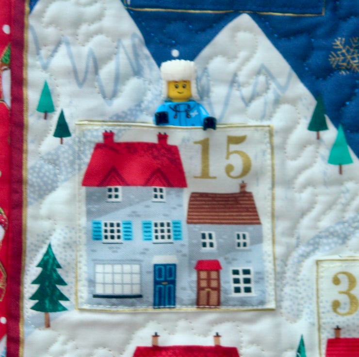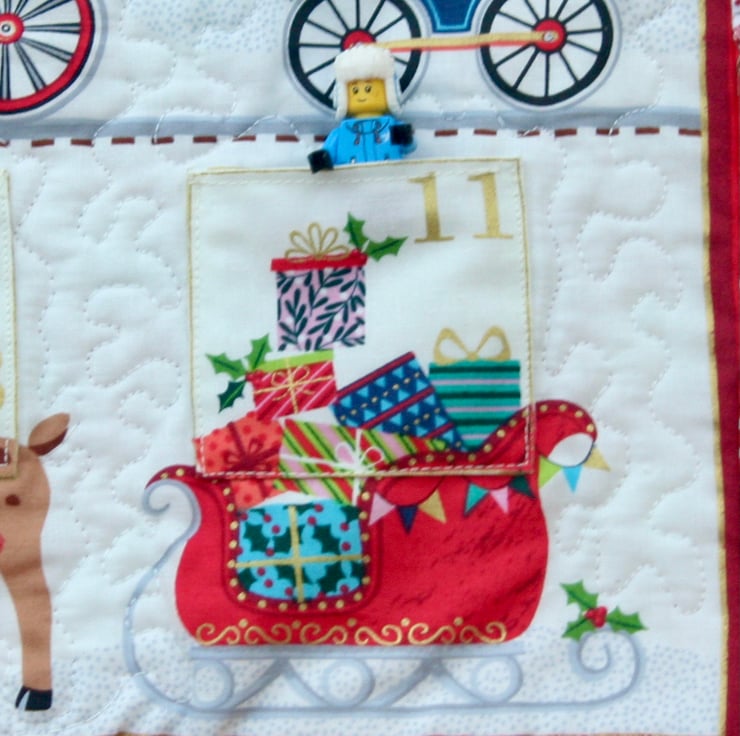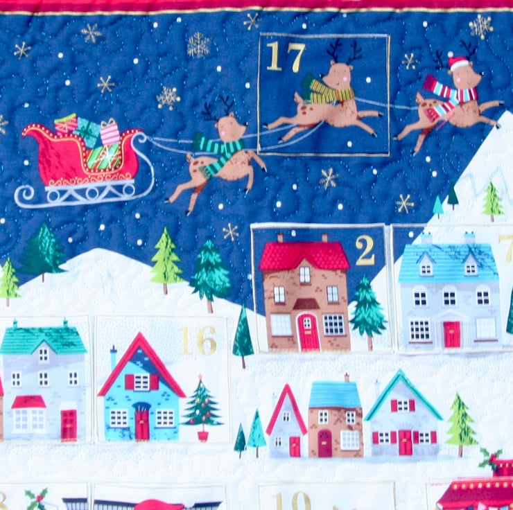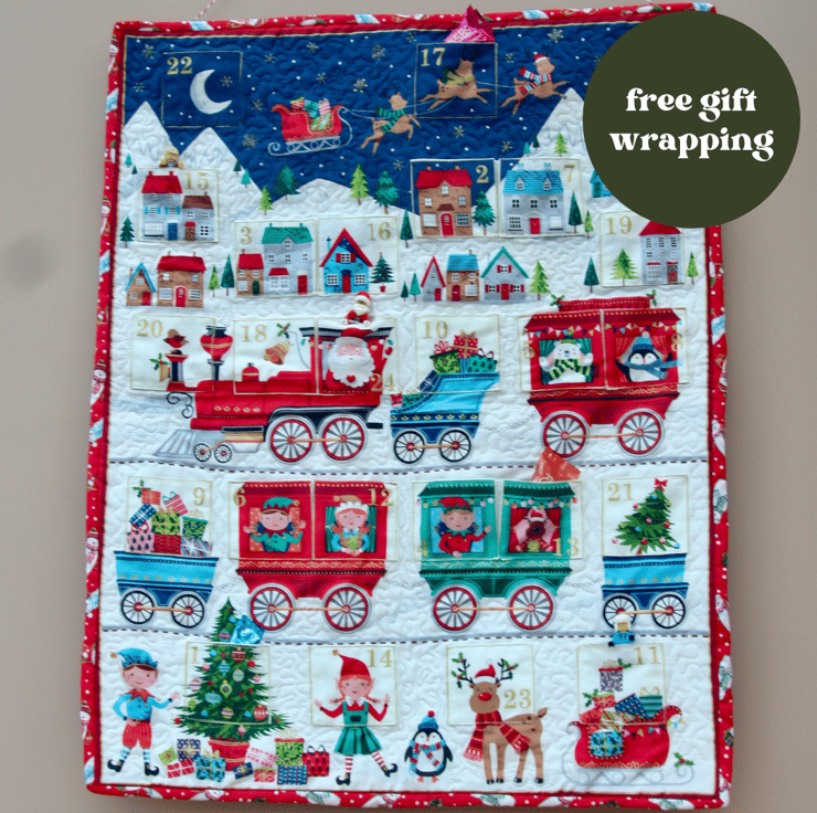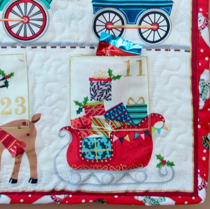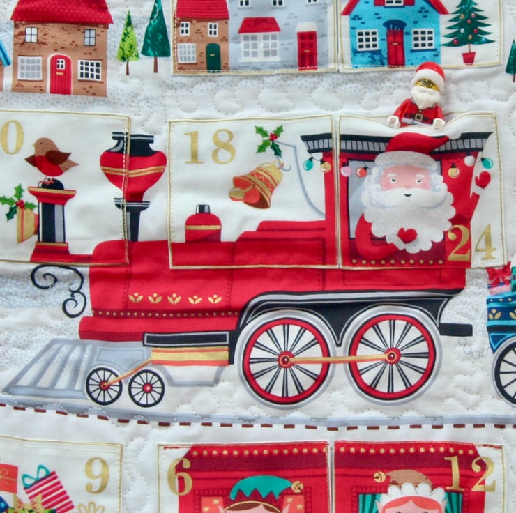 The fabric Advent Calendar has a train, elves and Santa on the front as well as 24 pockets ready to be filled with small treats of your choice. It is approximately 30 inches (76cm) by 24 inches (61cm). The backing is a red fabric with a fun print covered in quirky snowmen. A layer of eco-friendly wadding (made from recycled plastic bottles) is used to give some weight to the calendar. The three layers are quilted together with a meandering design and bound with the same fabric as the backing.
