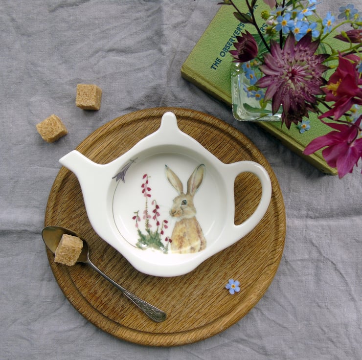 My illustrations of a brown hare, bell heather and harebell inspired by walks in the Northumbrian moors have been professionally printed onto ceramic transfers which are cut and applied by hand to compose the finished design.