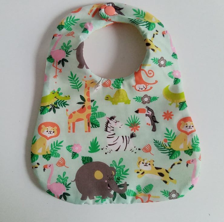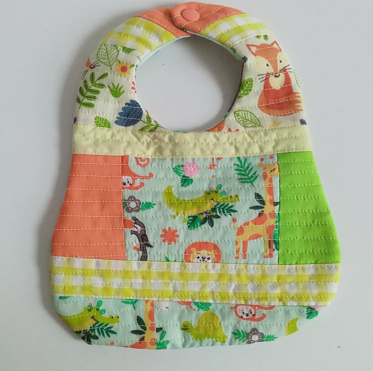 A small bib suitable for 0-6 months with a popper fastening. This bib is reversible with quilted patchwork one side and a cute safari design on the other side with a cotton batting centre.