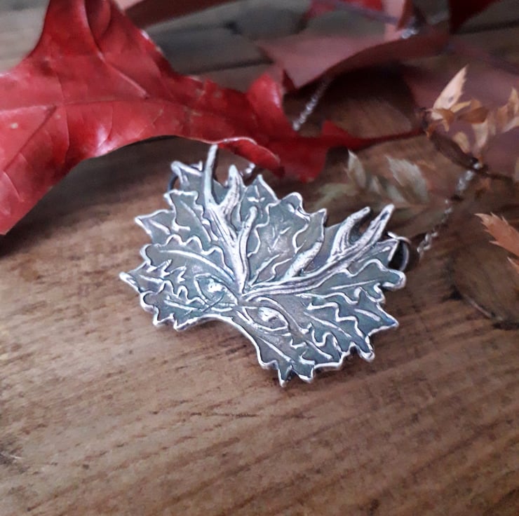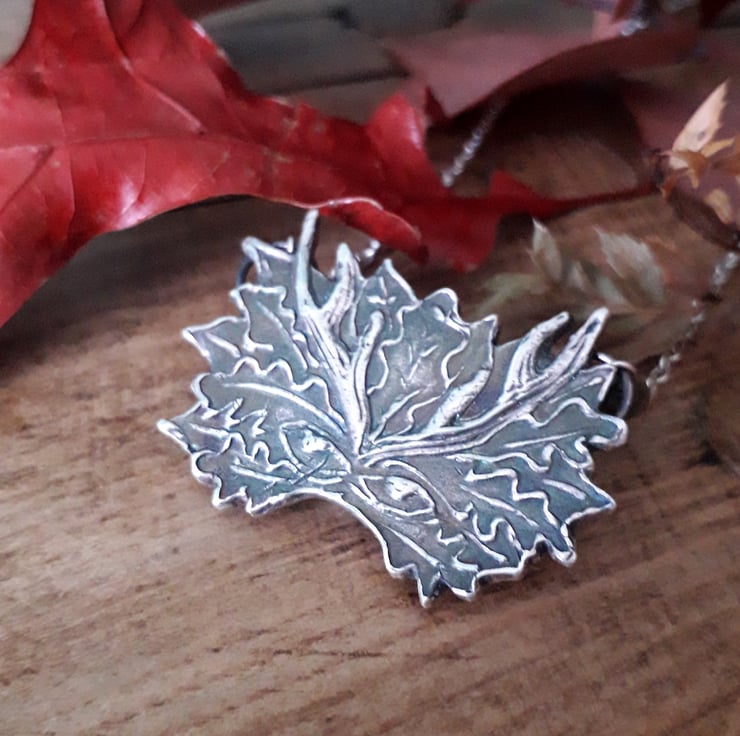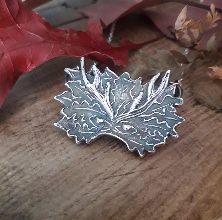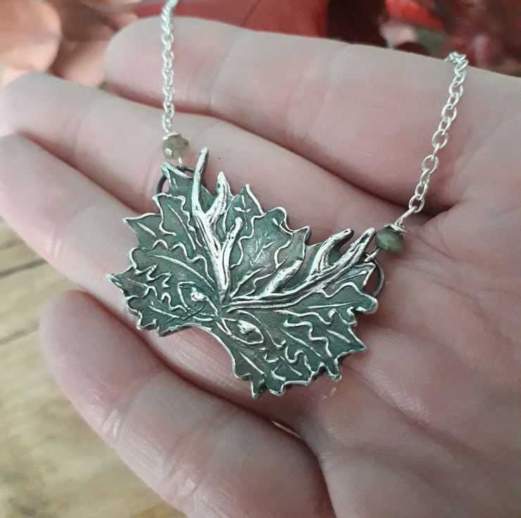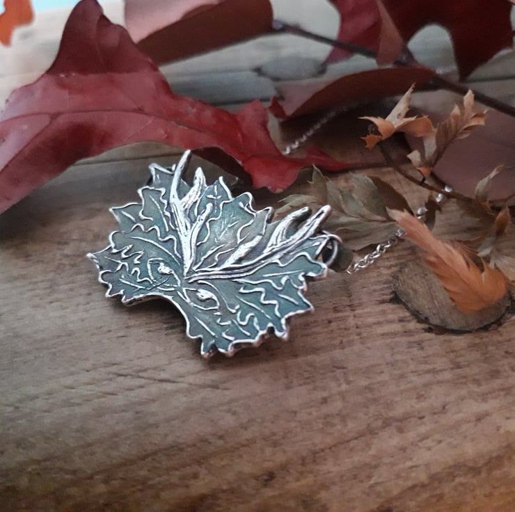 This Green Man is made with fine silver and sterling silver and has a fine green/blueish patina that might darken a little over time.