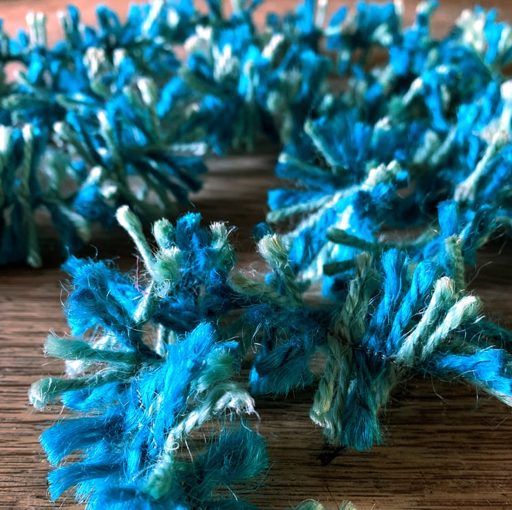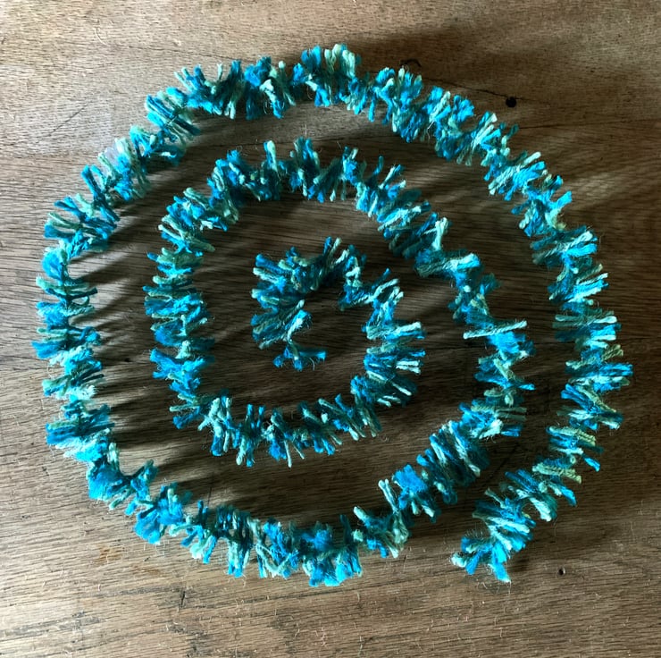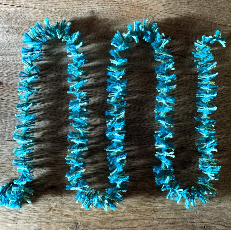 This beautiful, bright teal Strinsel is made from nowt but jute and cotton thread. Available in 2 metre lengths, it is sewn together, by me, at my old oak dining table. It should therefore not be cut to size, otherwise it will all unravel. It should also be kept away from fire and flame.