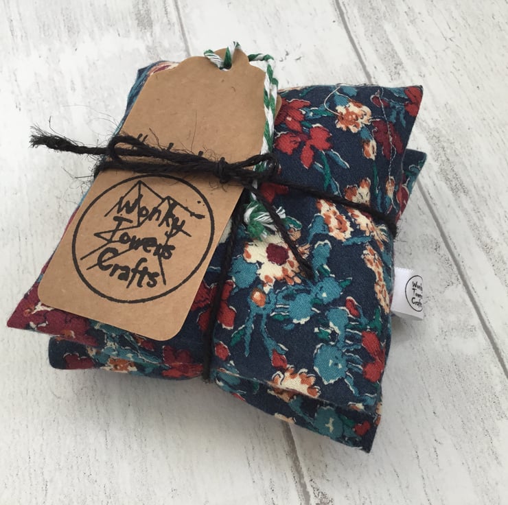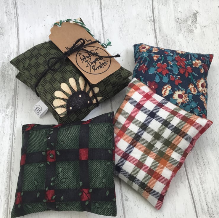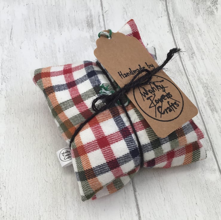 Here we have a pair of microwaveable hand warmers with removable, washable covers. The inner bags are filled with dry rice. The covers are made from a selection of brushed cotton fabrics. Just whizz the bags in the microwave before you go out and then pop them in your coat pockets. They will stay warm for about an hour and help to keep your hands toasty. If the covers get grubby when you’re gardening or throwing that tennis ball again … they can easily be removed and washed with your usual laundry.