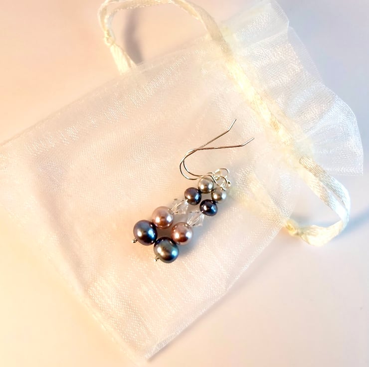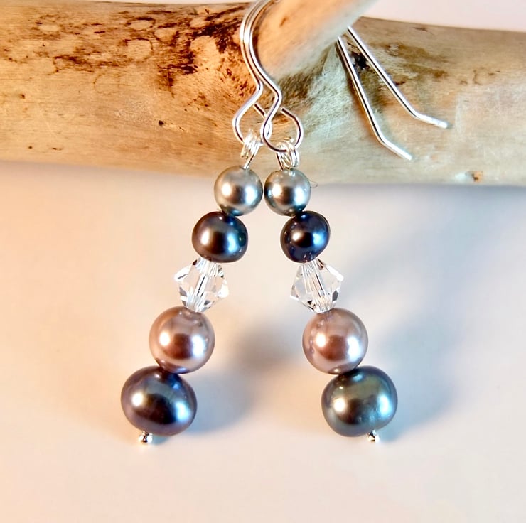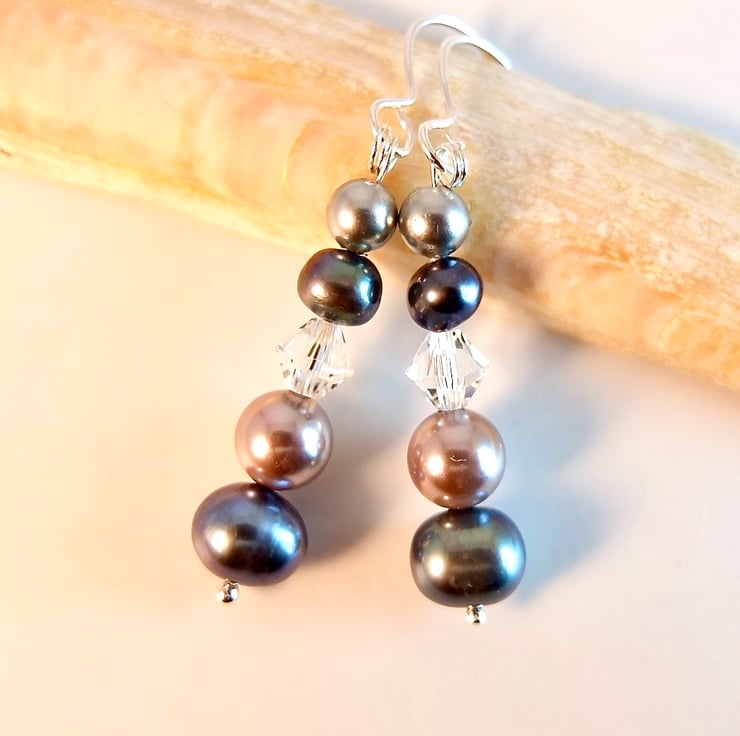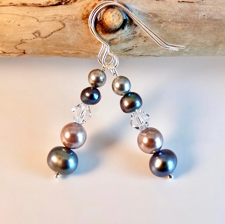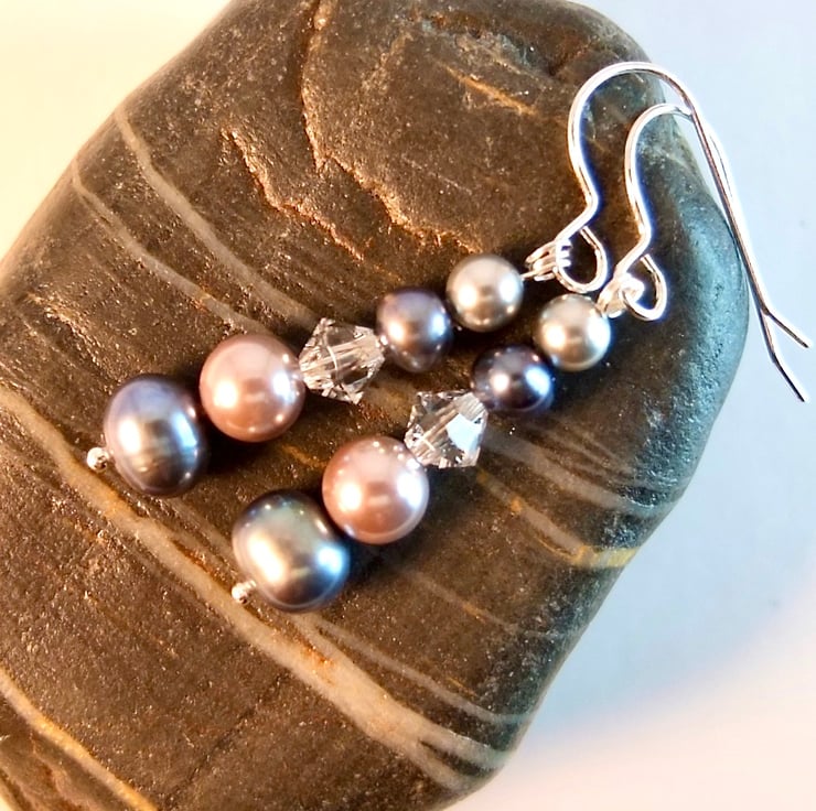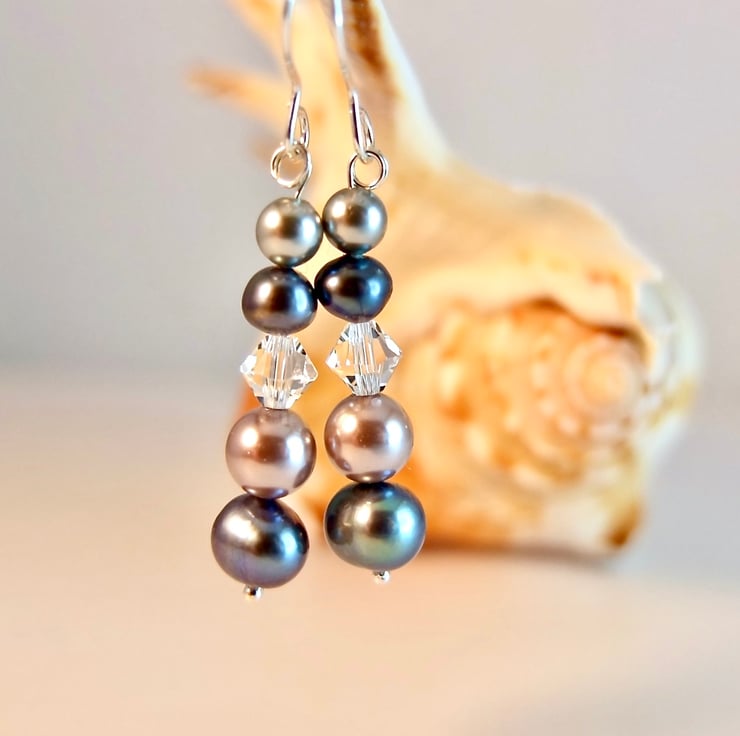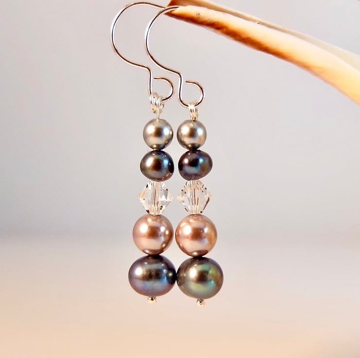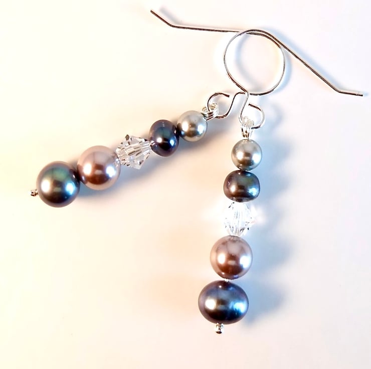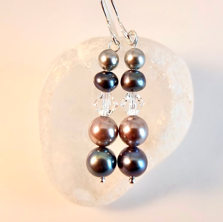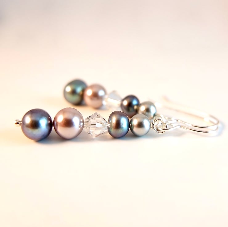 Each earring is made from a 7m freshwater, silver-grey, peacock potato Pearl, 6mm lavender shell Pearl, 5mm Swarovski crystal, 4mm freshwater, silver-grey, peacock potato pearl and a 3.5mm silver-grey shell Pearl.