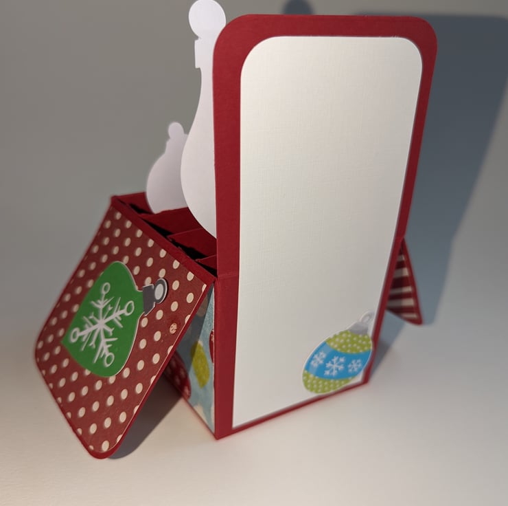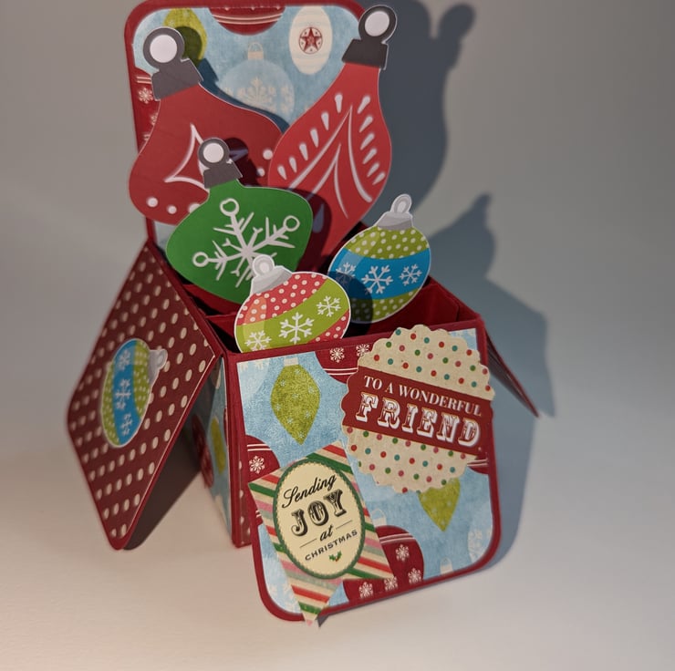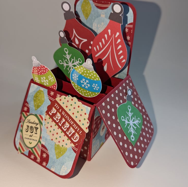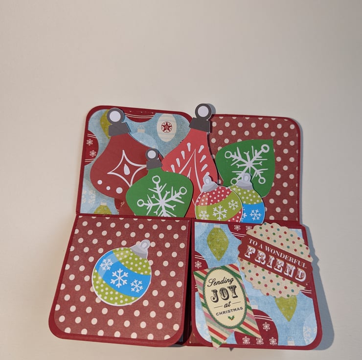The card is a deep red base decorated with Christmas papers and die cut baubles. The sentiment on the front panel reads "To a Wonderful Friend" and "Sending Joy at Christmas".