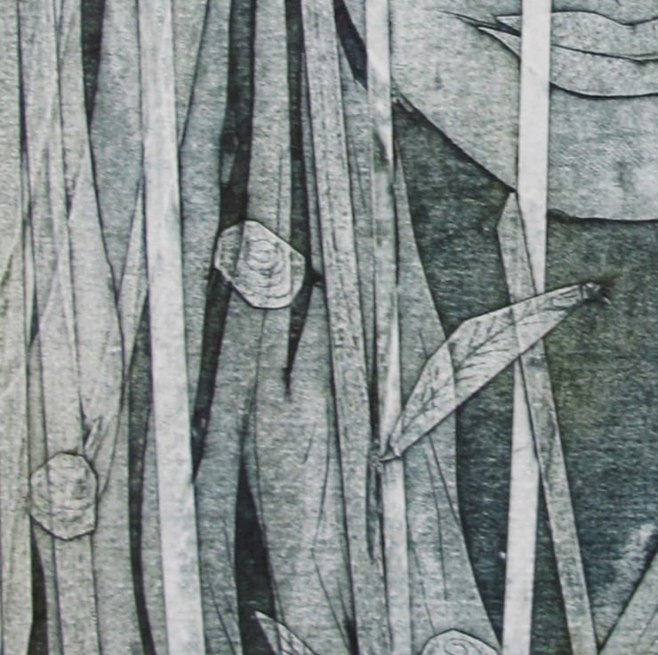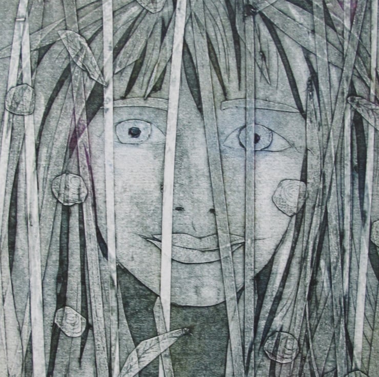 I started this collagraph by just doing a standard portrait of a woman face but felt as though it needed a little bit more depth. I collaged long strips of thin tape over my printing plate interspersed with small leaves and flowers. The hair and the grasses merge together to give a mysterious effect.
