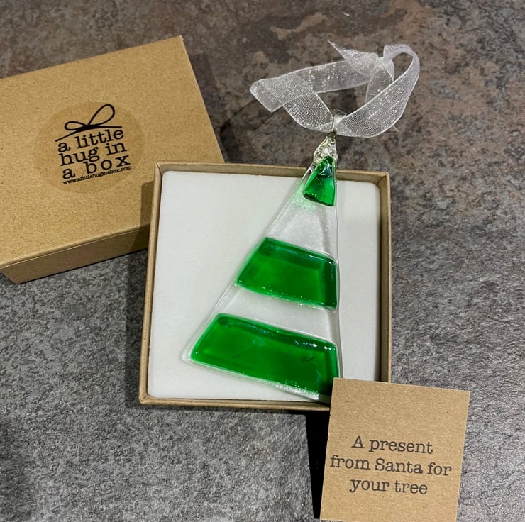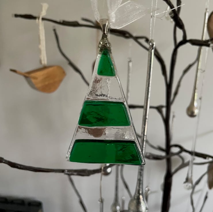 Beautiful clear fused glass tree shaped Christmas tree decoration with Green Fused Stripes. The tree measures approx 6cm and would make a lovely addition to your decor this Christmas.